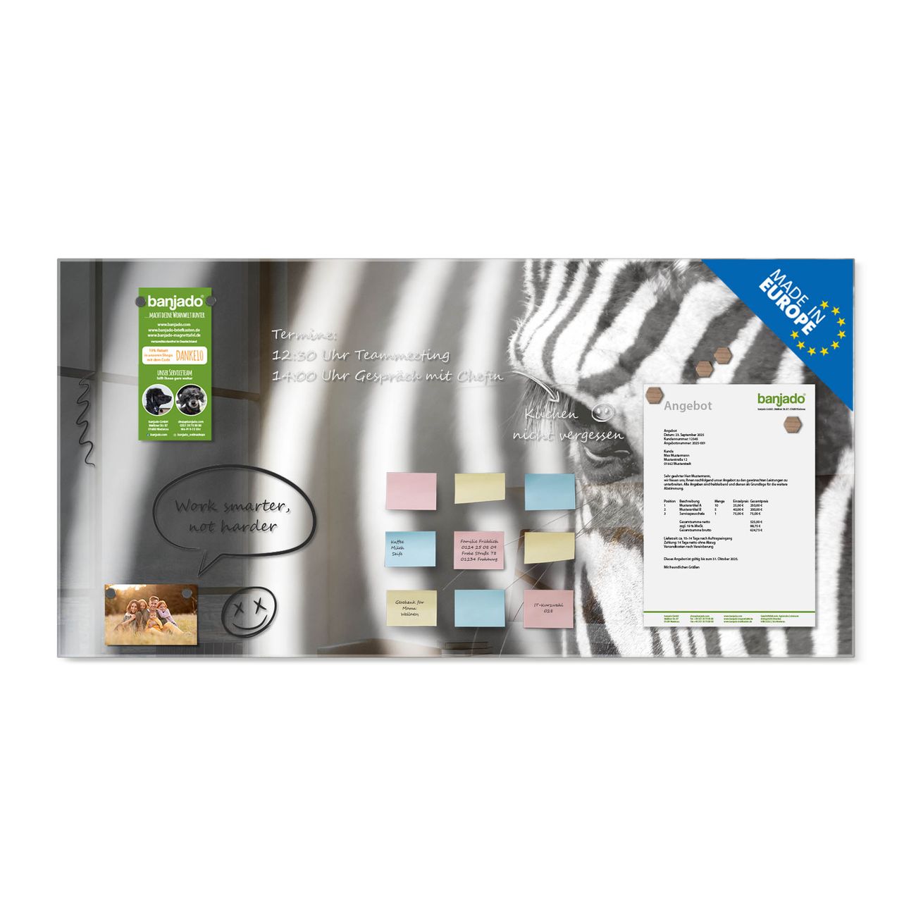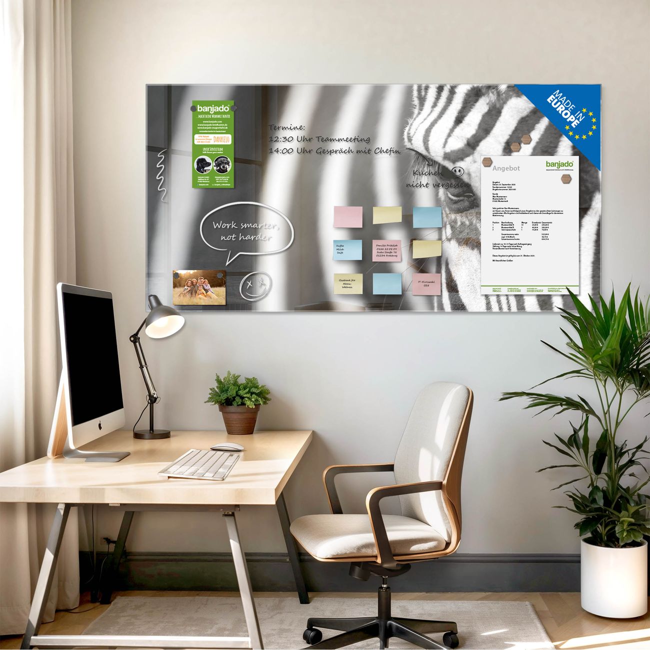 Jede Glas Magnettafel wird in unserer Werkstatt von Hand gefertigt und sorgfältig geprüft. So erhalten Sie ein echtes Qualitätsprodukt, das Funktion und Ästhetik perfekt vereint.?? Warum banjado?