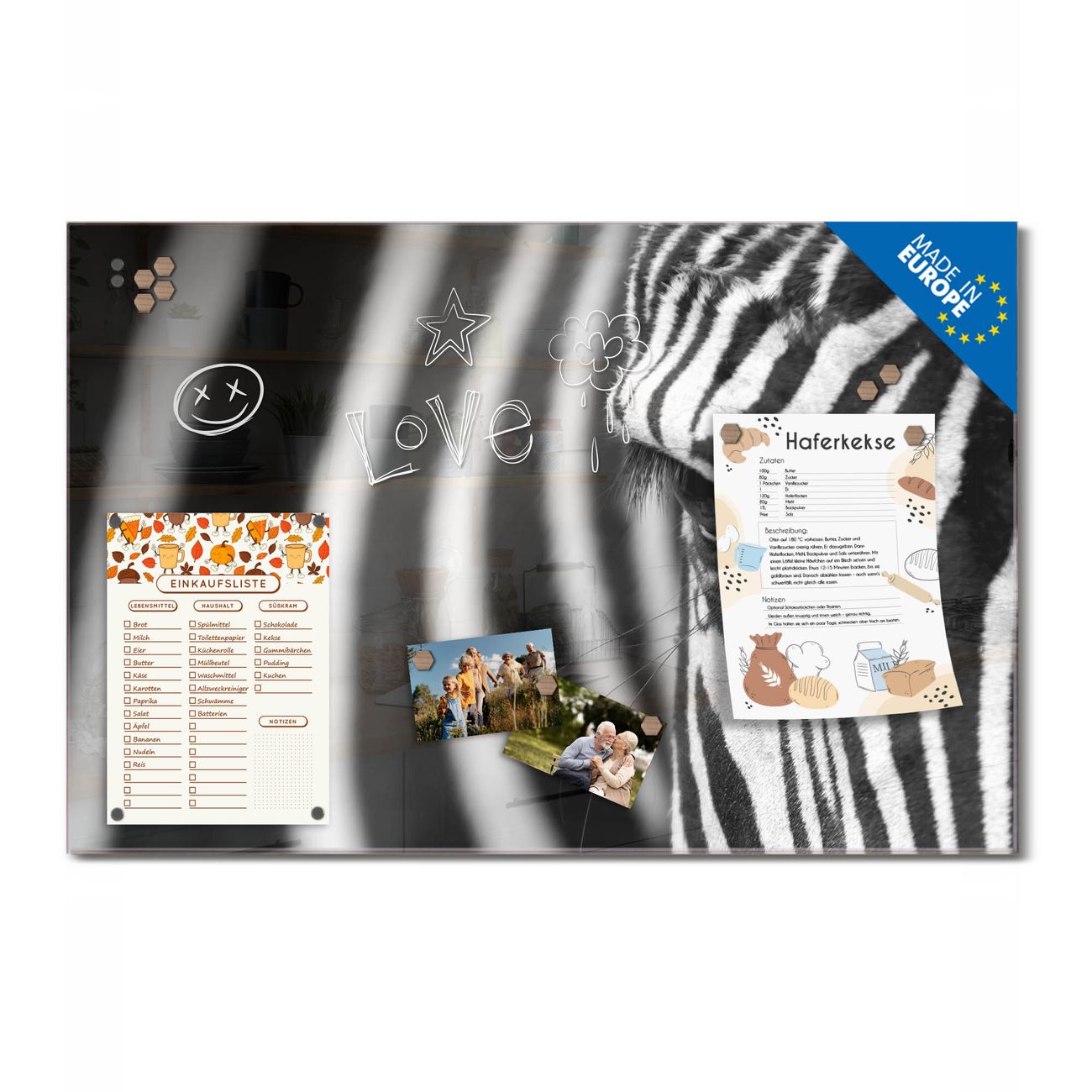 Ein Stück Design, das Ihren Alltag organisiert. Schreiben, heften, inspirieren - alles an einem Ort. Qualität, die man spürt. Montage leicht gemacht. Handwerk mit Herz - veredelt in Sachsen. Einzigartiges Design mit Motiv Motiv Zebra En Face Beschreibbare Glasoberfläche, leicht zu reinigen Starke Magnetkraft durch Stahlrückwand Inklusive 4 Neodym-Magneten Flexible Montageoptionen Handveredelt in Sachsen - Qualität, die bleibt