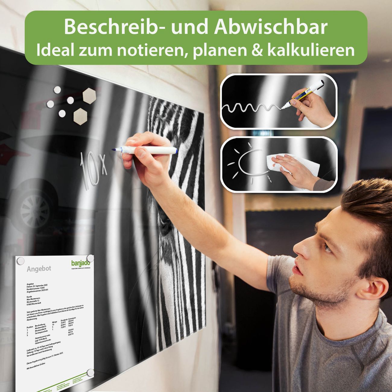 Jede Glas Magnettafel wird in unserer Werkstatt von Hand gefertigt und sorgfältig geprüft. So erhalten Sie ein echtes Qualitätsprodukt, das Funktion und Ästhetik perfekt vereint.?? Warum banjado?