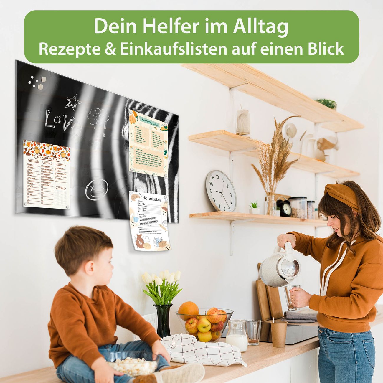 Auf der glatten Glasoberfläche lassen sich Termine, Rezepte oder Notizen ganz einfach mit Kreidestiften festhalten und rückstandslos entfernen. Starke Neodym-Magnete halten Ihre wichtigsten Erinnerungen sicher an Ort und Stelle. So entsteht Ihre ganz persönliche Ideenwand - jeden Tag neu.
