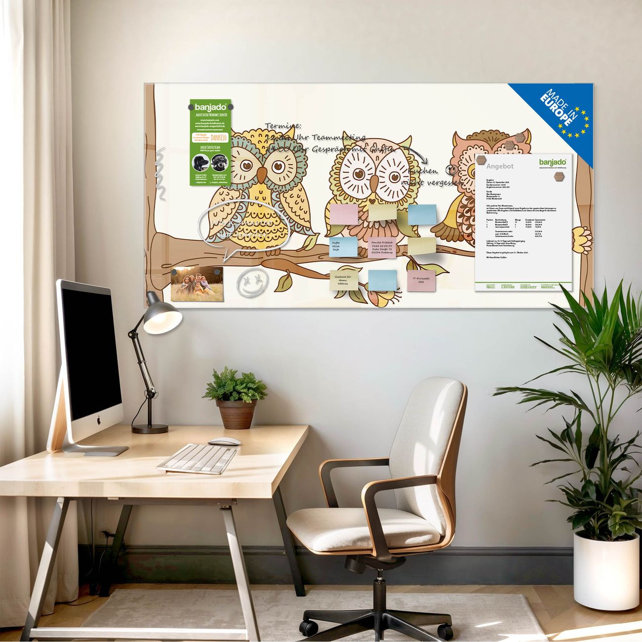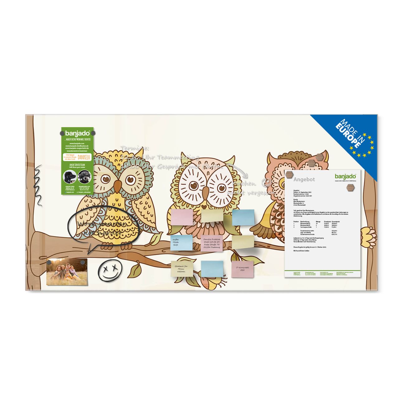 Ein Stück Design, das Ihren Alltag organisiert. Schreiben, heften, inspirieren - alles an einem Ort. Qualität, die man spürt. Montage leicht gemacht. Handwerk mit Herz - veredelt in Sachsen. Einzigartiges Design mit Motiv Motiv Zehn-Augen-Prinzip Beschreibbare Glasoberfläche, leicht zu reinigen Starke Magnetkraft durch Stahlrückwand Inklusive 4 Neodym-Magneten Flexible Montageoptionen Handveredelt in Sachsen - Qualität, die bleibt
