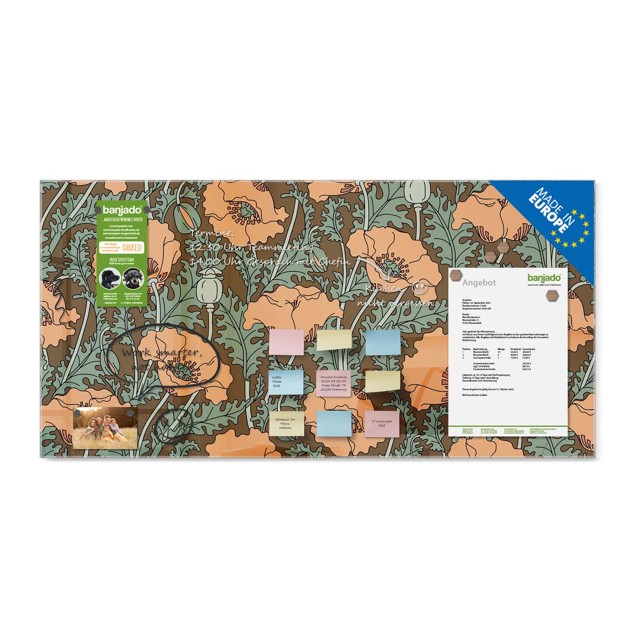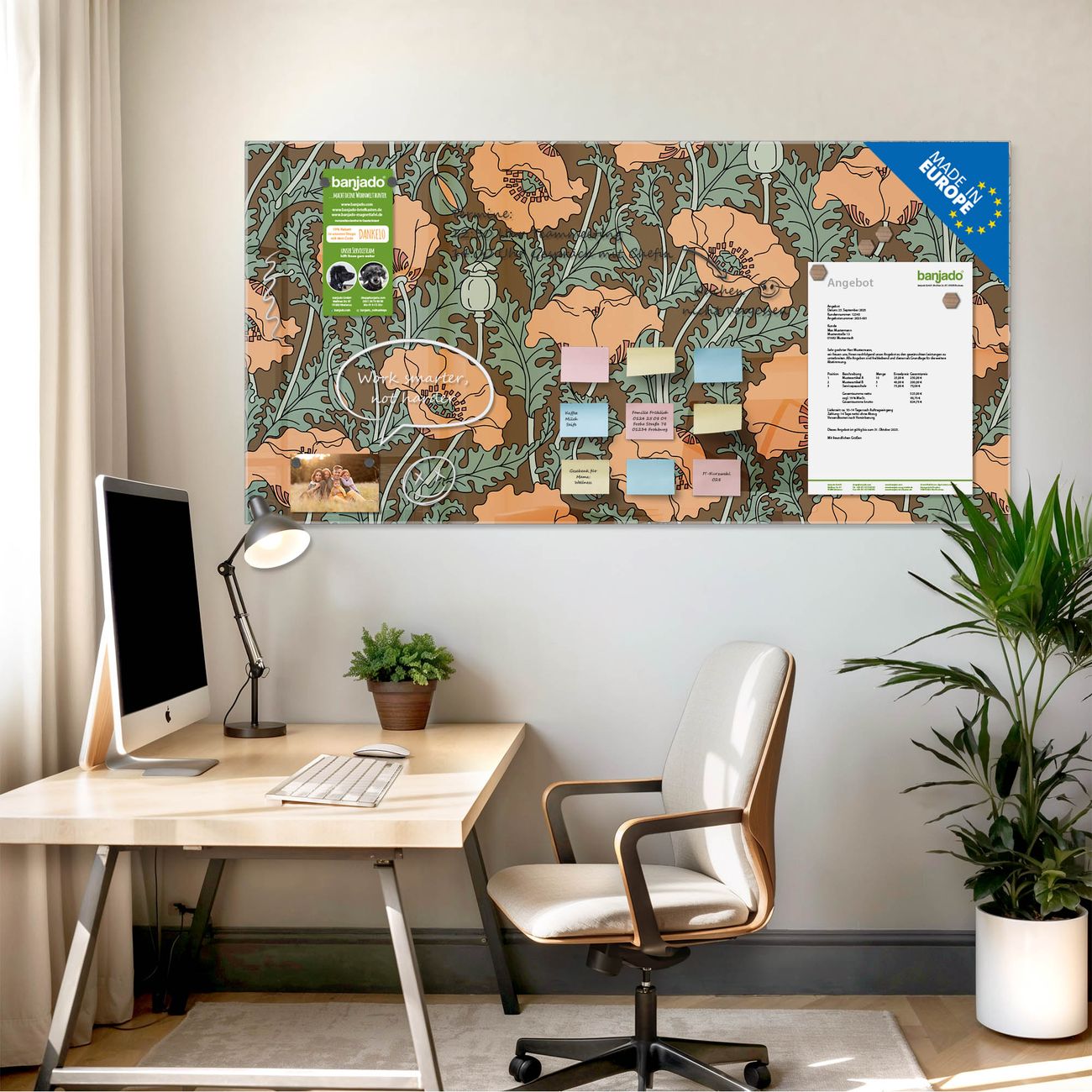 Die banjado Glas Magnettafel mit dem Motiv Motiv Zeichnung Mohn verbindet Funktionalität mit Stil. Sie ersetzt das Zettelchaos durch klare Strukturen und bringt dabei eine warme, natürliche Atmosphäre in Ihr Zuhause. Ob im Büro, in der Küche oder im Eingangsbereich - dieses Design-Board zieht Blicke an und sorgt für Ordnung mit Charakter.