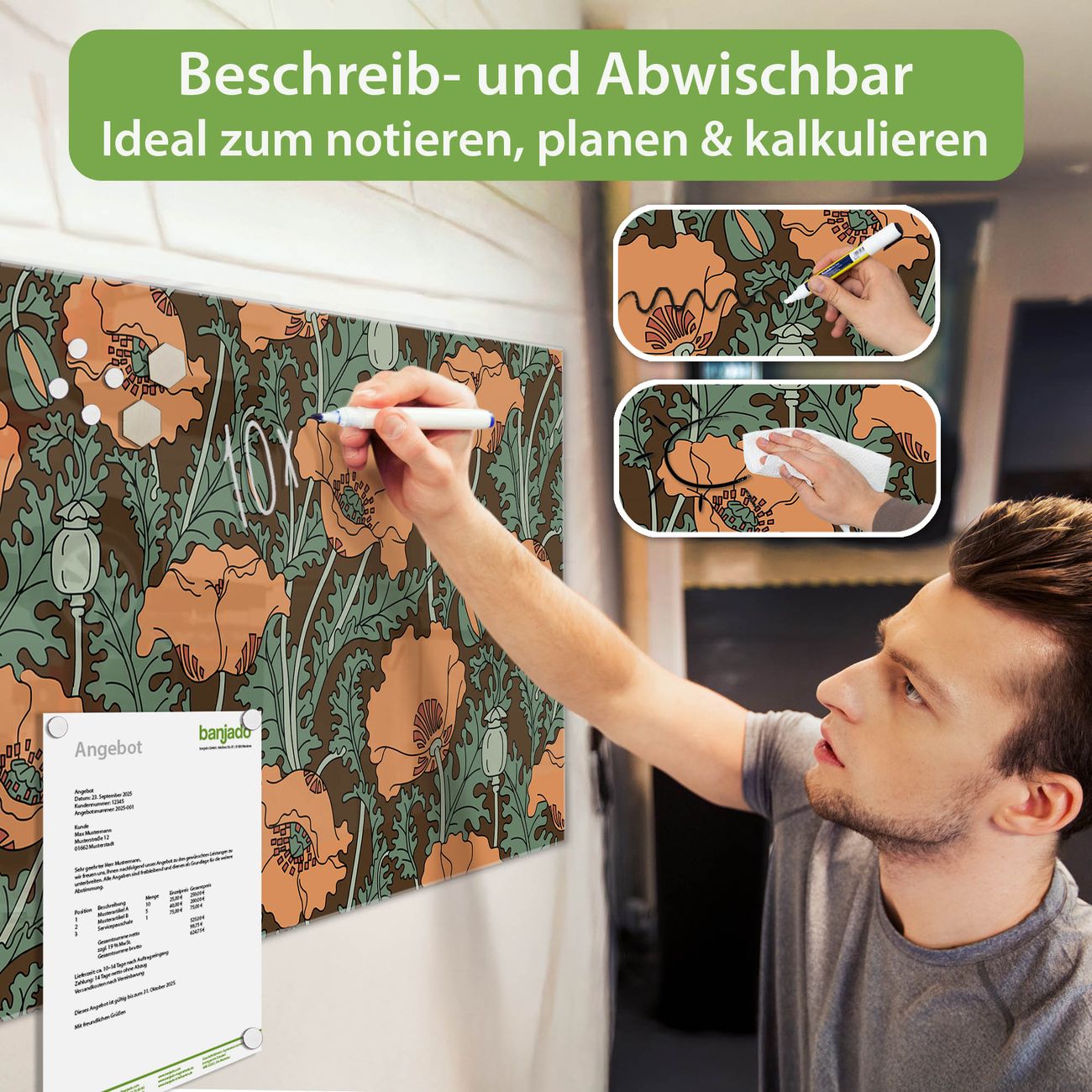 Jede Glas Magnettafel wird in unserer Werkstatt von Hand gefertigt und sorgfältig geprüft. So erhalten Sie ein echtes Qualitätsprodukt, das Funktion und Ästhetik perfekt vereint.?? Warum banjado?