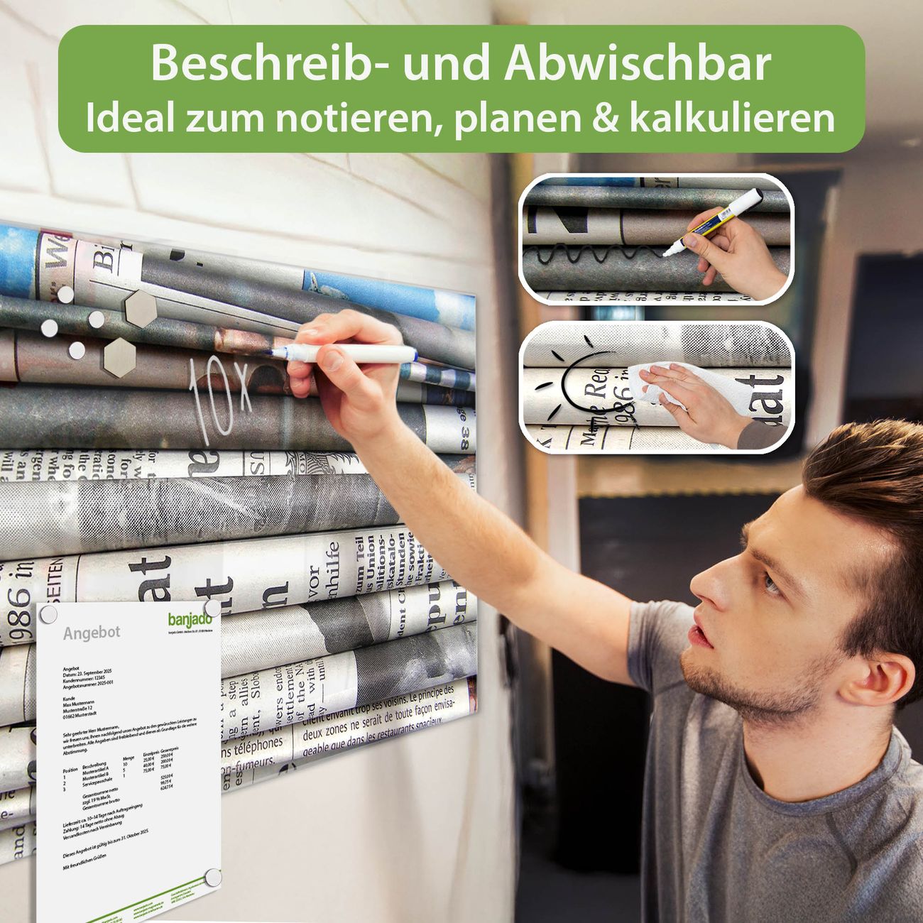Die banjado Glas Magnettafel mit dem Motiv Motiv Zeitungen verbindet Funktionalität mit Stil. Sie ersetzt das Zettelchaos durch klare Strukturen und bringt dabei eine warme, natürliche Atmosphäre in Ihr Zuhause. Ob im Büro, in der Küche oder im Eingangsbereich - dieses Design-Board zieht Blicke an und sorgt für Ordnung mit Charakter.