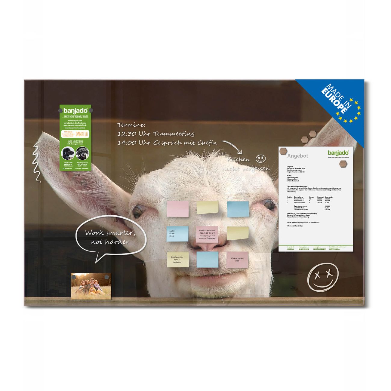Jede Glas Magnettafel wird in unserer Werkstatt von Hand gefertigt und sorgfältig geprüft. So erhalten Sie ein echtes Qualitätsprodukt, das Funktion und Ästhetik perfekt vereint.?? Warum banjado?