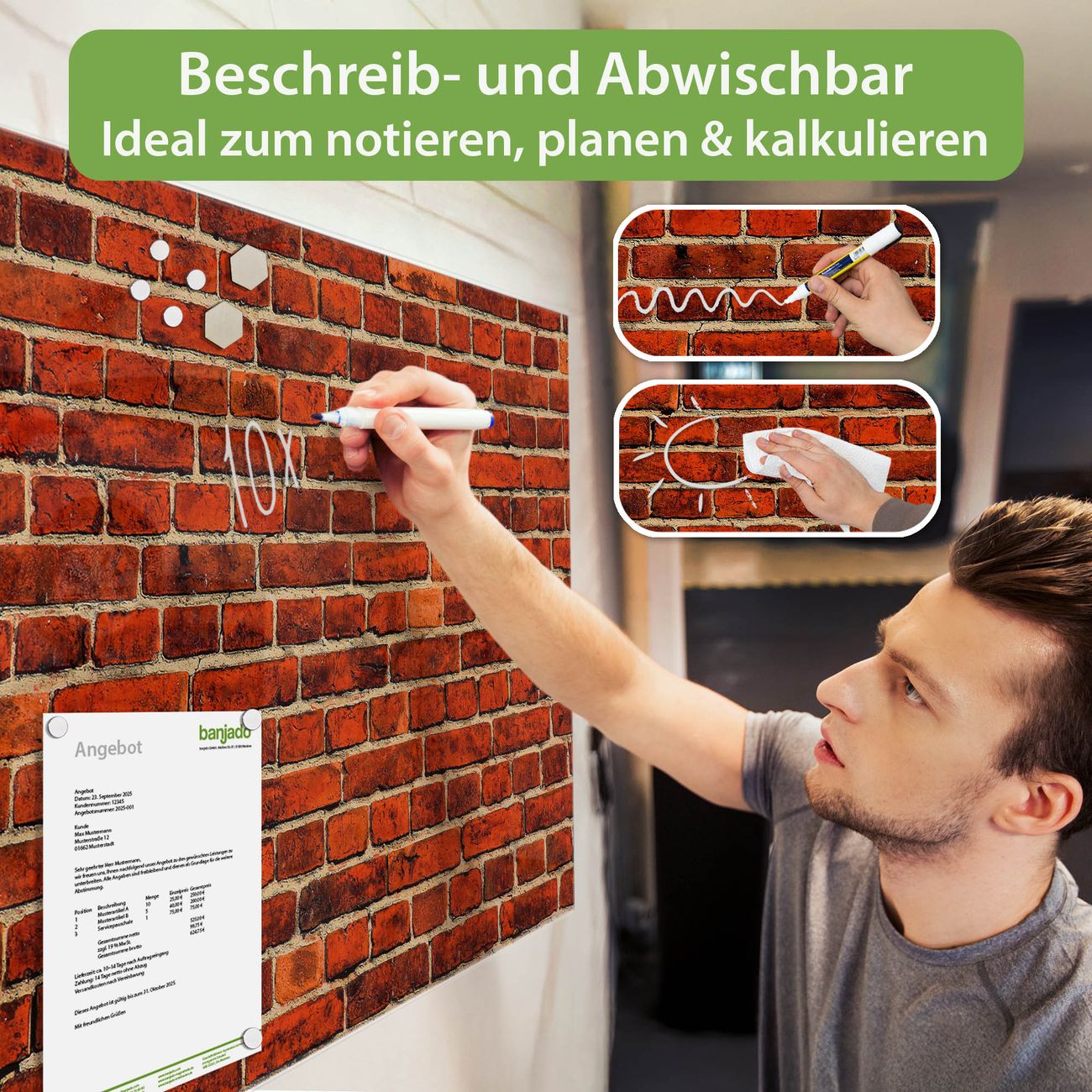 Jede Glas Magnettafel wird in unserer Werkstatt von Hand gefertigt und sorgfältig geprüft. So erhalten Sie ein echtes Qualitätsprodukt, das Funktion und Ästhetik perfekt vereint.?? Warum banjado?
