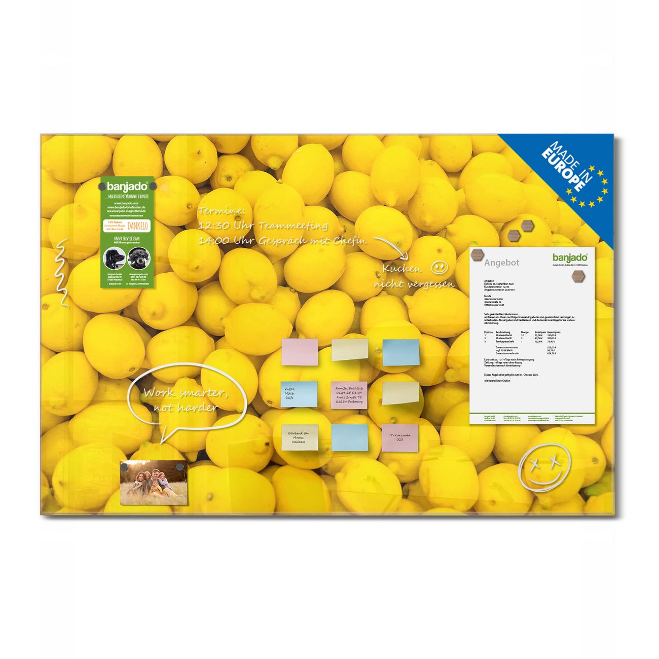 Jede Glas Magnettafel wird in unserer Werkstatt von Hand gefertigt und sorgfältig geprüft. So erhalten Sie ein echtes Qualitätsprodukt, das Funktion und Ästhetik perfekt vereint.?? Warum banjado?