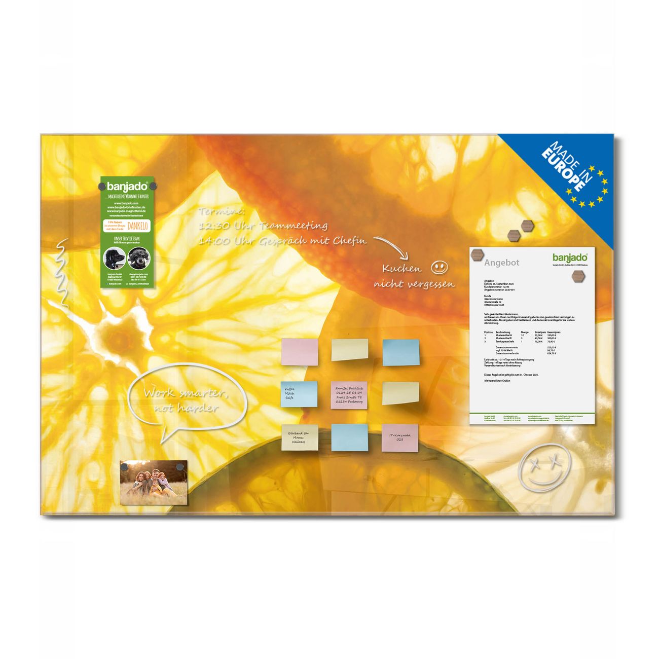 Ein Stück Design, das Ihren Alltag organisiert. Schreiben, heften, inspirieren - alles an einem Ort. Qualität, die man spürt. Montage leicht gemacht. Handwerk mit Herz - veredelt in Sachsen. Einzigartiges Design mit Motiv Motiv Zitrusfrüchte Beschreibbare Glasoberfläche, leicht zu reinigen Starke Magnetkraft durch Stahlrückwand Inklusive 4 Neodym-Magneten Flexible Montageoptionen Handveredelt in Sachsen - Qualität, die bleibt