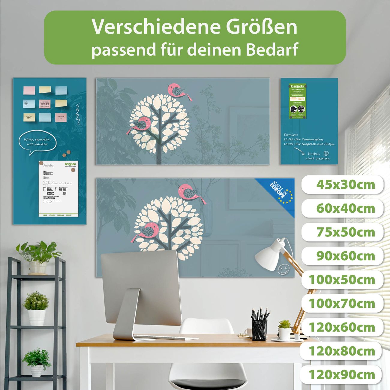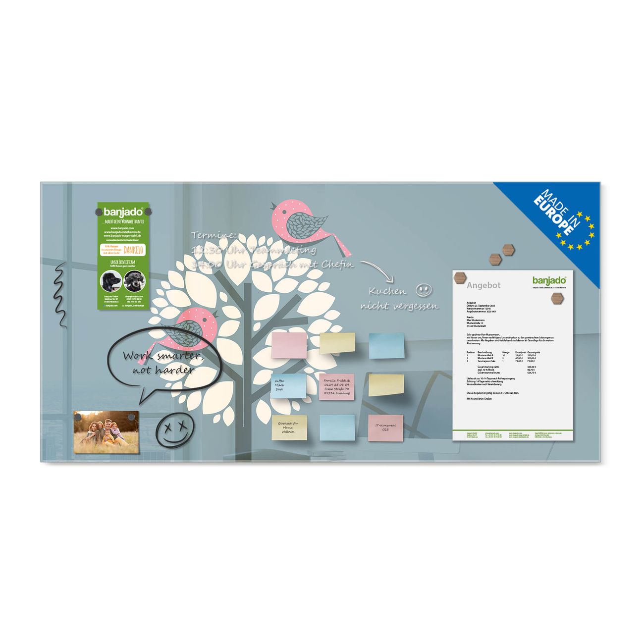 Jede Glas Magnettafel wird in unserer Werkstatt von Hand gefertigt und sorgfältig geprüft. So erhalten Sie ein echtes Qualitätsprodukt, das Funktion und Ästhetik perfekt vereint.?? Warum banjado?
