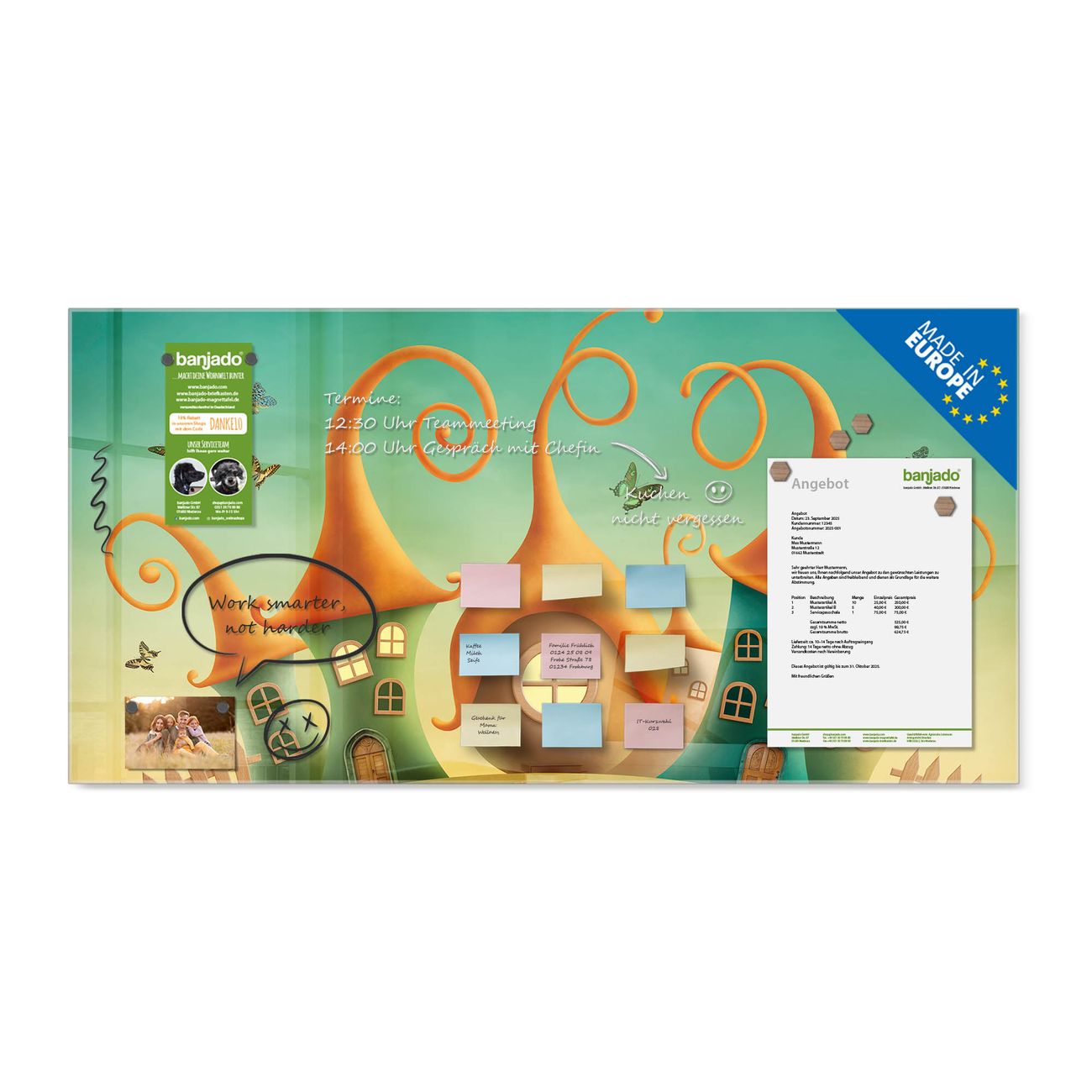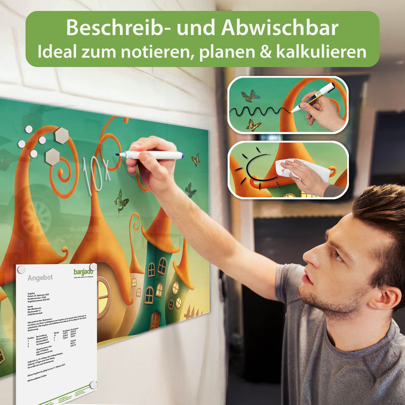 Jede Glas Magnettafel wird in unserer Werkstatt von Hand gefertigt und sorgfältig geprüft. So erhalten Sie ein echtes Qualitätsprodukt, das Funktion und Ästhetik perfekt vereint.?? Warum banjado?