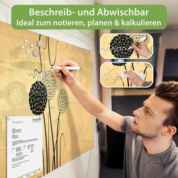 Auf der glatten Glasoberfläche lassen sich Termine, Rezepte oder Notizen ganz einfach mit Kreidestiften festhalten und rückstandslos entfernen. Starke Neodym-Magnete halten Ihre wichtigsten Erinnerungen sicher an Ort und Stelle. So entsteht Ihre ganz persönliche Ideenwand - jeden Tag neu.