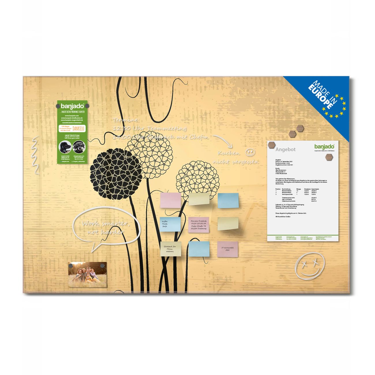 Jede Glas Magnettafel wird in unserer Werkstatt von Hand gefertigt und sorgfältig geprüft. So erhalten Sie ein echtes Qualitätsprodukt, das Funktion und Ästhetik perfekt vereint.?? Warum banjado?