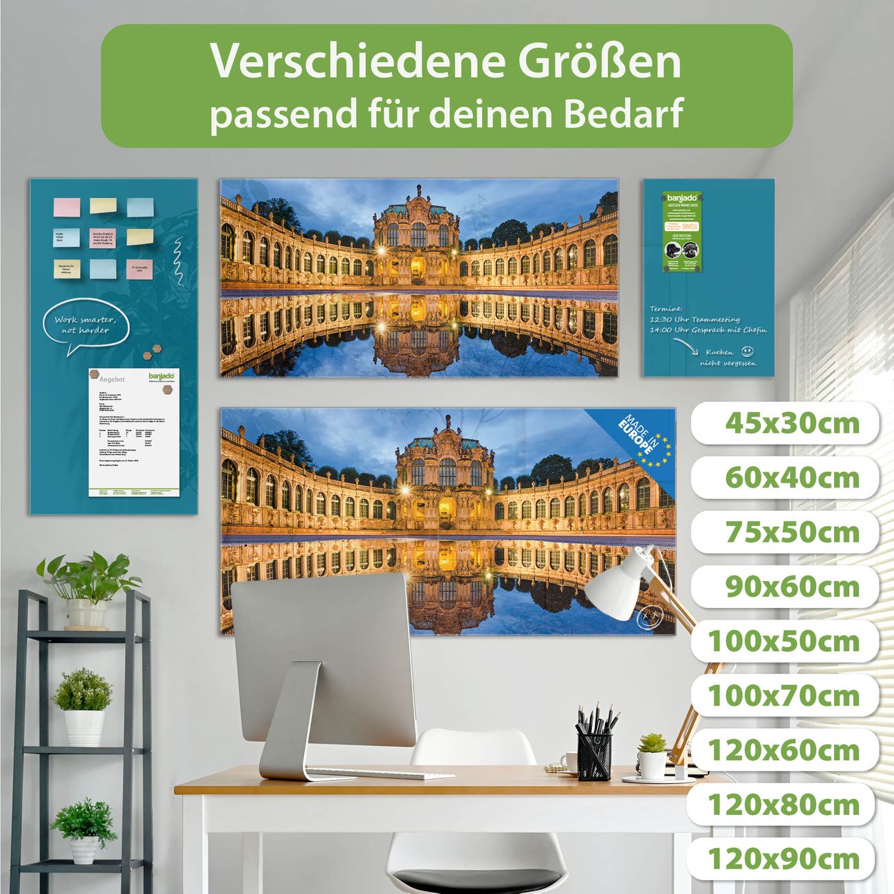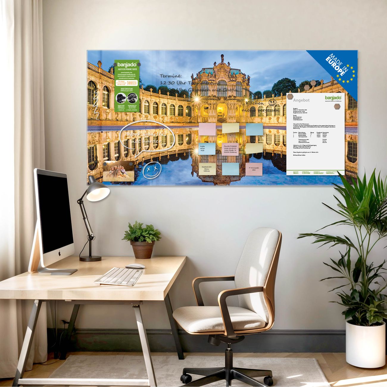 Jede Glas Magnettafel wird in unserer Werkstatt von Hand gefertigt und sorgfältig geprüft. So erhalten Sie ein echtes Qualitätsprodukt, das Funktion und Ästhetik perfekt vereint.?? Warum banjado?