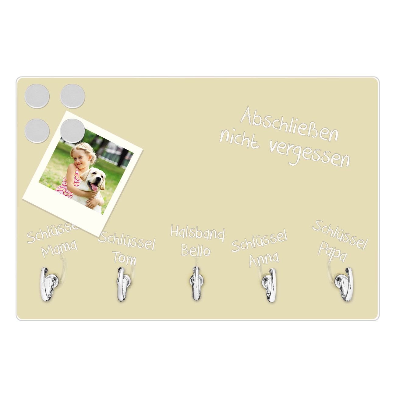 FUNKTION: Mit dem banjado Schlüsselbrett Beige hat Ihre Suche nach dem Schlüsselbund endlich ein Ende! Auf gesamt 5 Haken finden auch die größten Schlüssel ihren Platz. Durch den farbenfrohen Farbedruck ist das Schlüsselboard ein Blickfang in jeder Wohnung. DESIGN: Die Schlüsselleiste mit Farbe Beige hat ein sehr ansprechendes und ausgefallenes Design. Das Glasboard besteht aus einer gehärteten Glasscheibe mit dem Farbe Ihrer Wahl. Ihre neue Schlüsselaufbewahrung ist funktionell und ein optisches Highlight. DETAILS: Das Schlüsselbrett ist 30 x 20 x 4,5 CM (BxHxT). Das ganze Board besteht aus gehärtetem Sicherheitsglas, die Haken zur Selbstmontage präsentieren sich in Edelstahl-Optik. Für einen sicheren Halt erfolgt die Aufhängung an 2 vorgefertigten Haltern an der Rückseite. Das Montagematerial fügen wir bei. NUTZEN: Hier findet alles seinen Platz: Schlüsselbunde, Geschirrtücher, Hundeleinen oder Kinderjacken. Das Glas kann mit Kreidestiften bzw. Whiteboard-Marker beschrieben werden, mit extrastarken Neodym-Magneten können Sie auch Notizen anheften. BANJADO: Wir sind ein kleines Team aus dem Herzen von Sachsen und fertigen Ihre neue Schlüsselaufbewahrung von Hand an. Sie erhalten Handarbeit und keine preiswerte Importware. Wir hoffen, dass Ihnen unsere Idee zusagt, herzlichst das banjado Team.