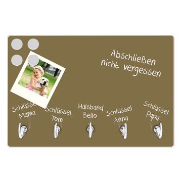 FUNKTION: Mit dem banjado Schlüsselbrett Gold Metallic hat Ihre Suche nach dem Schlüsselbund endlich ein Ende! Auf gesamt 5 Haken finden auch die größten Schlüssel ihren Platz. Durch den farbenfrohen Farbedruck ist das Schlüsselboard ein Blickfang in jeder Wohnung. DESIGN: Die Schlüsselleiste mit Farbe Gold Metallic hat ein sehr ansprechendes und ausgefallenes Design. Das Glasboard besteht aus einer gehärteten Glasscheibe mit dem Farbe Ihrer Wahl. Ihre neue Schlüsselaufbewahrung ist funktionell und ein optisches Highlight. DETAILS: Das Schlüsselbrett ist 30 x 20 x 4,5 CM (BxHxT). Das ganze Board besteht aus gehärtetem Sicherheitsglas, die Haken zur Selbstmontage präsentieren sich in Edelstahl-Optik. Für einen sicheren Halt erfolgt die Aufhängung an 2 vorgefertigten Haltern an der Rückseite. Das Montagematerial fügen wir bei. NUTZEN: Hier findet alles seinen Platz: Schlüsselbunde, Geschirrtücher, Hundeleinen oder Kinderjacken. Das Glas kann mit Kreidestiften bzw. Whiteboard-Marker beschrieben werden, mit extrastarken Neodym-Magneten können Sie auch Notizen anheften. BANJADO: Wir sind ein kleines Team aus dem Herzen von Sachsen und fertigen Ihre neue Schlüsselaufbewahrung von Hand an. Sie erhalten Handarbeit und keine preiswerte Importware. Wir hoffen, dass Ihnen unsere Idee zusagt, herzlichst das banjado Team.
