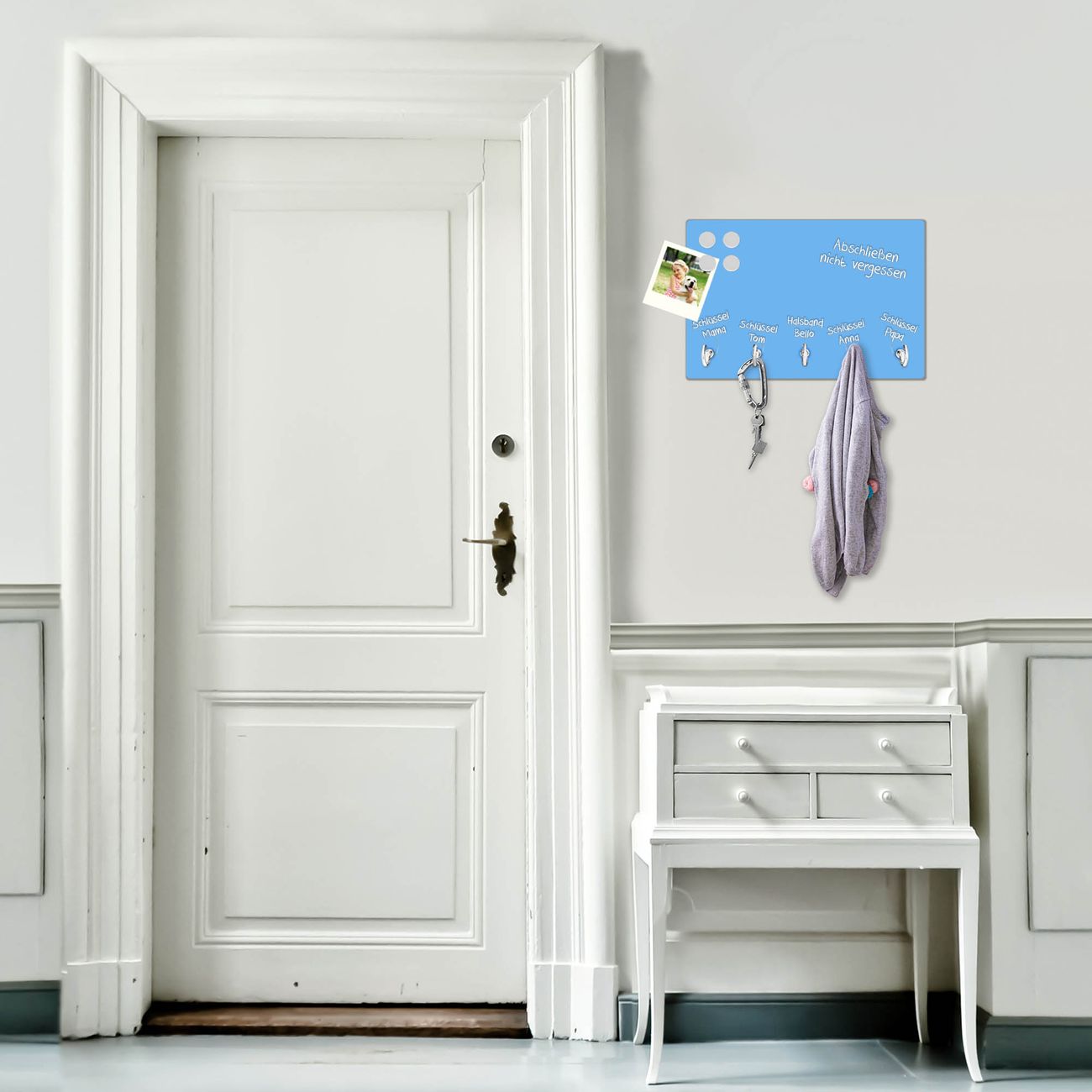 FUNKTION: Mit dem banjado Schlüsselbrett Pastellblau hat Ihre Suche nach dem Schlüsselbund endlich ein Ende! Auf gesamt 5 Haken finden auch die größten Schlüssel ihren Platz. Durch den farbenfrohen Farbedruck ist das Schlüsselboard ein Blickfang in jeder Wohnung. DESIGN: Die Schlüsselleiste mit Farbe Pastellblau hat ein sehr ansprechendes und ausgefallenes Design. Das Glasboard besteht aus einer gehärteten Glasscheibe mit dem Farbe Ihrer Wahl. Ihre neue Schlüsselaufbewahrung ist funktionell und ein optisches Highlight. DETAILS: Das Schlüsselbrett ist 30 x 20 x 4,5 CM (BxHxT). Das ganze Board besteht aus gehärtetem Sicherheitsglas, die Haken zur Selbstmontage präsentieren sich in Edelstahl-Optik. Für einen sicheren Halt erfolgt die Aufhängung an 2 vorgefertigten Haltern an der Rückseite. Das Montagematerial fügen wir bei. NUTZEN: Hier findet alles seinen Platz: Schlüsselbunde, Geschirrtücher, Hundeleinen oder Kinderjacken. Das Glas kann mit Kreidestiften bzw. Whiteboard-Marker beschrieben werden, mit extrastarken Neodym-Magneten können Sie auch Notizen anheften. BANJADO: Wir sind ein kleines Team aus dem Herzen von Sachsen und fertigen Ihre neue Schlüsselaufbewahrung von Hand an. Sie erhalten Handarbeit und keine preiswerte Importware. Wir hoffen, dass Ihnen unsere Idee zusagt, herzlichst das banjado Team.