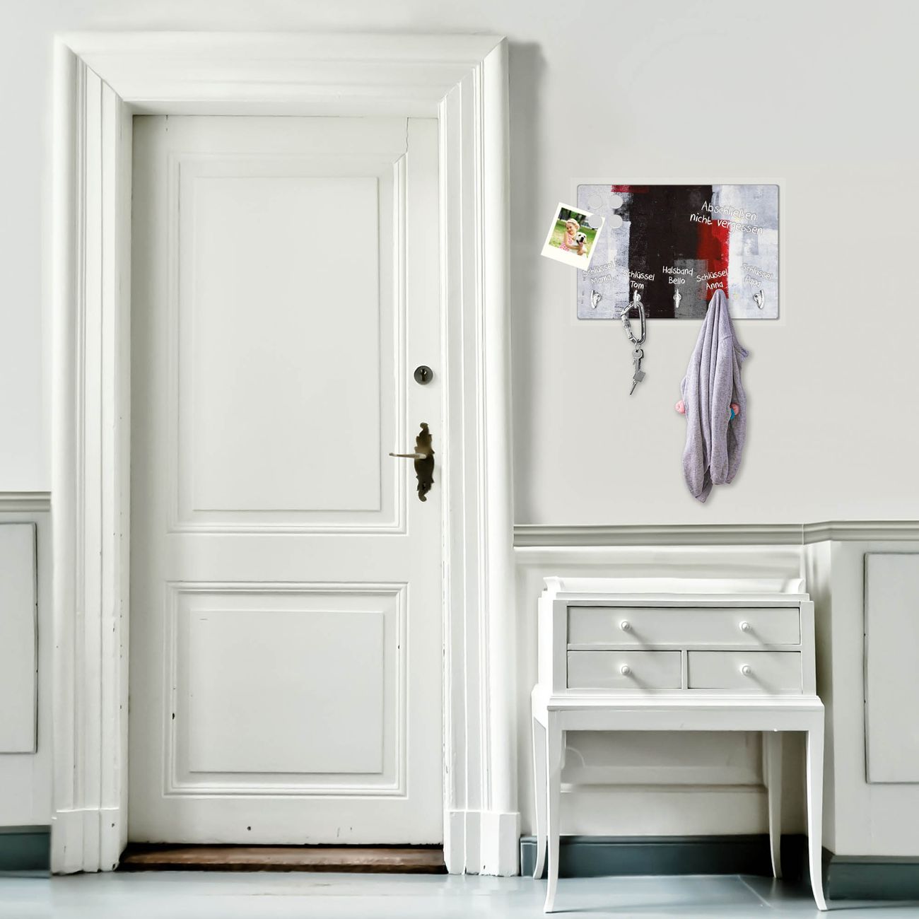 FUNKTION: Mit dem banjado Schlüsselbrett Abstrakt Rot hat Ihre Suche nach dem Schlüsselbund endlich ein Ende! Auf gesamt 5 Haken finden auch die größten Schlüssel ihren Platz. Durch den farbenfrohen Motivdruck ist das Schlüsselboard ein Blickfang in jeder Wohnung. DESIGN: Die Schlüsselleiste mit Motiv Abstrakt Rot hat ein sehr ansprechendes und ausgefallenes Design. Das Glasboard besteht aus einer gehärteten Glasscheibe mit dem Motiv Ihrer Wahl. Ihre neue Schlüsselaufbewahrung ist funktionell und ein optisches Highlight. DETAILS: Das Schlüsselbrett ist 30 x 20 x 4,5 CM (BxHxT). Das ganze Board besteht aus gehärtetem Sicherheitsglas, die Haken zur Selbstmontage präsentieren sich in Edelstahl-Optik. Für einen sicheren Halt erfolgt die Aufhängung an 2 vorgefertigten Haltern an der Rückseite. Das Montagematerial fügen wir bei. NUTZEN: Hier findet alles seinen Platz: Schlüsselbunde, Geschirrtücher, Hundeleinen oder Kinderjacken. Das Glas kann mit Kreidestiften bzw. Whiteboard-Marker beschrieben werden, mit extrastarken Neodym-Magneten können Sie auch Notizen anheften. BANJADO: Wir sind ein kleines Team aus dem Herzen von Sachsen und fertigen Ihre neue Schlüsselaufbewahrung von Hand an. Sie erhalten Handarbeit und keine preiswerte Importware. Wir hoffen, dass Ihnen unsere Idee zusagt, herzlichst das banjado Team.