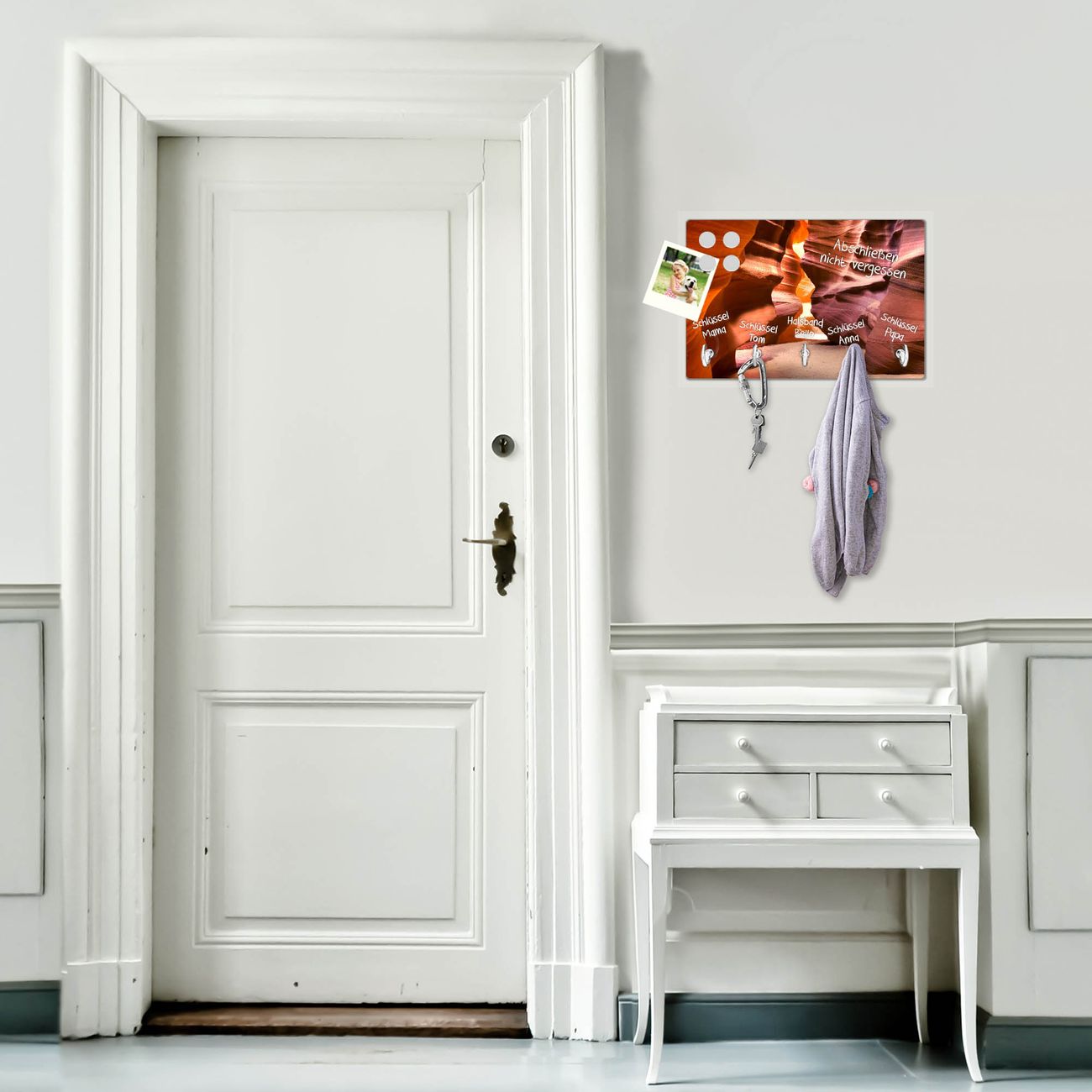 FUNKTION: Mit dem banjado Schlüsselbrett Antelope Canyon hat Ihre Suche nach dem Schlüsselbund endlich ein Ende! Auf gesamt 5 Haken finden auch die größten Schlüssel ihren Platz. Durch den farbenfrohen Motivdruck ist das Schlüsselboard ein Blickfang in jeder Wohnung. DESIGN: Die Schlüsselleiste mit Motiv Antelope Canyon hat ein sehr ansprechendes und ausgefallenes Design. Das Glasboard besteht aus einer gehärteten Glasscheibe mit dem Motiv Ihrer Wahl. Ihre neue Schlüsselaufbewahrung ist funktionell und ein optisches Highlight. DETAILS: Das Schlüsselbrett ist 30 x 20 x 4,5 CM (BxHxT). Das ganze Board besteht aus gehärtetem Sicherheitsglas, die Haken zur Selbstmontage präsentieren sich in Edelstahl-Optik. Für einen sicheren Halt erfolgt die Aufhängung an 2 vorgefertigten Haltern an der Rückseite. Das Montagematerial fügen wir bei. NUTZEN: Hier findet alles seinen Platz: Schlüsselbunde, Geschirrtücher, Hundeleinen oder Kinderjacken. Das Glas kann mit Kreidestiften bzw. Whiteboard-Marker beschrieben werden, mit extrastarken Neodym-Magneten können Sie auch Notizen anheften. BANJADO: Wir sind ein kleines Team aus dem Herzen von Sachsen und fertigen Ihre neue Schlüsselaufbewahrung von Hand an. Sie erhalten Handarbeit und keine preiswerte Importware. Wir hoffen, dass Ihnen unsere Idee zusagt, herzlichst das banjado Team.