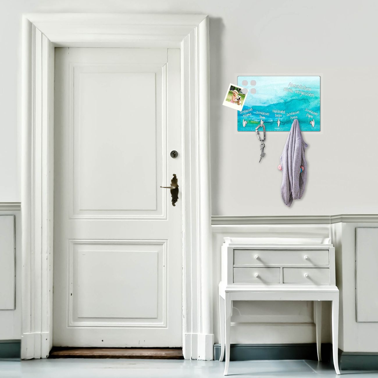 FUNKTION: Mit dem banjado Schlüsselbrett Aquarell Blau hat Ihre Suche nach dem Schlüsselbund endlich ein Ende! Auf gesamt 5 Haken finden auch die größten Schlüssel ihren Platz. Durch den farbenfrohen Motivdruck ist das Schlüsselboard ein Blickfang in jeder Wohnung. DESIGN: Die Schlüsselleiste mit Motiv Aquarell Blau hat ein sehr ansprechendes und ausgefallenes Design. Das Glasboard besteht aus einer gehärteten Glasscheibe mit dem Motiv Ihrer Wahl. Ihre neue Schlüsselaufbewahrung ist funktionell und ein optisches Highlight. DETAILS: Das Schlüsselbrett ist 30 x 20 x 4,5 CM (BxHxT). Das ganze Board besteht aus gehärtetem Sicherheitsglas, die Haken zur Selbstmontage präsentieren sich in Edelstahl-Optik. Für einen sicheren Halt erfolgt die Aufhängung an 2 vorgefertigten Haltern an der Rückseite. Das Montagematerial fügen wir bei. NUTZEN: Hier findet alles seinen Platz: Schlüsselbunde, Geschirrtücher, Hundeleinen oder Kinderjacken. Das Glas kann mit Kreidestiften bzw. Whiteboard-Marker beschrieben werden, mit extrastarken Neodym-Magneten können Sie auch Notizen anheften. BANJADO: Wir sind ein kleines Team aus dem Herzen von Sachsen und fertigen Ihre neue Schlüsselaufbewahrung von Hand an. Sie erhalten Handarbeit und keine preiswerte Importware. Wir hoffen, dass Ihnen unsere Idee zusagt, herzlichst das banjado Team.