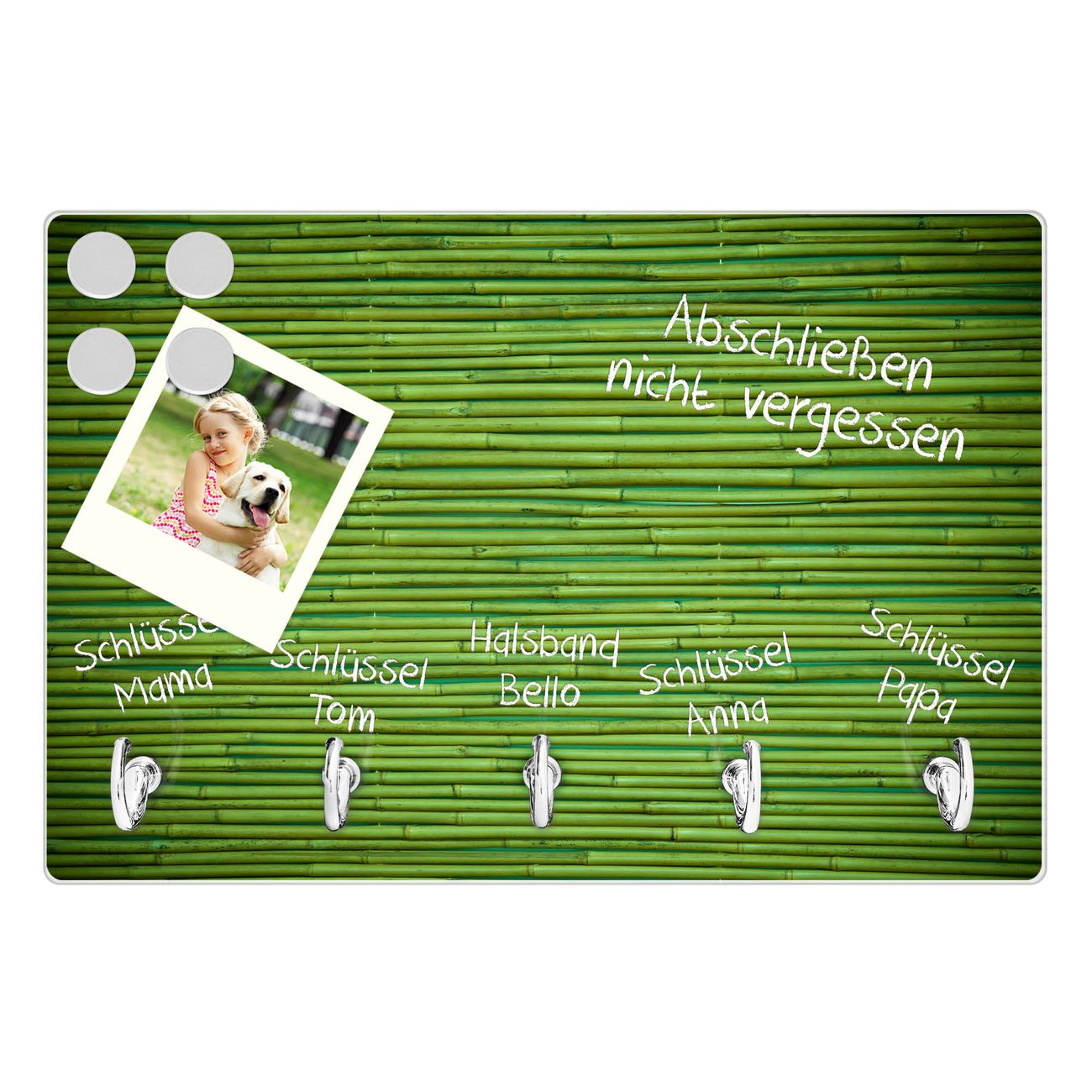 FUNKTION: Mit dem banjado Schlüsselbrett Bambus Grün hat Ihre Suche nach dem Schlüsselbund endlich ein Ende! Auf gesamt 5 Haken finden auch die größten Schlüssel ihren Platz. Durch den farbenfrohen Motivdruck ist das Schlüsselboard ein Blickfang in jeder Wohnung. DESIGN: Die Schlüsselleiste mit Motiv Bambus Grün hat ein sehr ansprechendes und ausgefallenes Design. Das Glasboard besteht aus einer gehärteten Glasscheibe mit dem Motiv Ihrer Wahl. Ihre neue Schlüsselaufbewahrung ist funktionell und ein optisches Highlight. DETAILS: Das Schlüsselbrett ist 30 x 20 x 4,5 CM (BxHxT). Das ganze Board besteht aus gehärtetem Sicherheitsglas, die Haken zur Selbstmontage präsentieren sich in Edelstahl-Optik. Für einen sicheren Halt erfolgt die Aufhängung an 2 vorgefertigten Haltern an der Rückseite. Das Montagematerial fügen wir bei. NUTZEN: Hier findet alles seinen Platz: Schlüsselbunde, Geschirrtücher, Hundeleinen oder Kinderjacken. Das Glas kann mit Kreidestiften bzw. Whiteboard-Marker beschrieben werden, mit extrastarken Neodym-Magneten können Sie auch Notizen anheften. BANJADO: Wir sind ein kleines Team aus dem Herzen von Sachsen und fertigen Ihre neue Schlüsselaufbewahrung von Hand an. Sie erhalten Handarbeit und keine preiswerte Importware. Wir hoffen, dass Ihnen unsere Idee zusagt, herzlichst das banjado Team.
