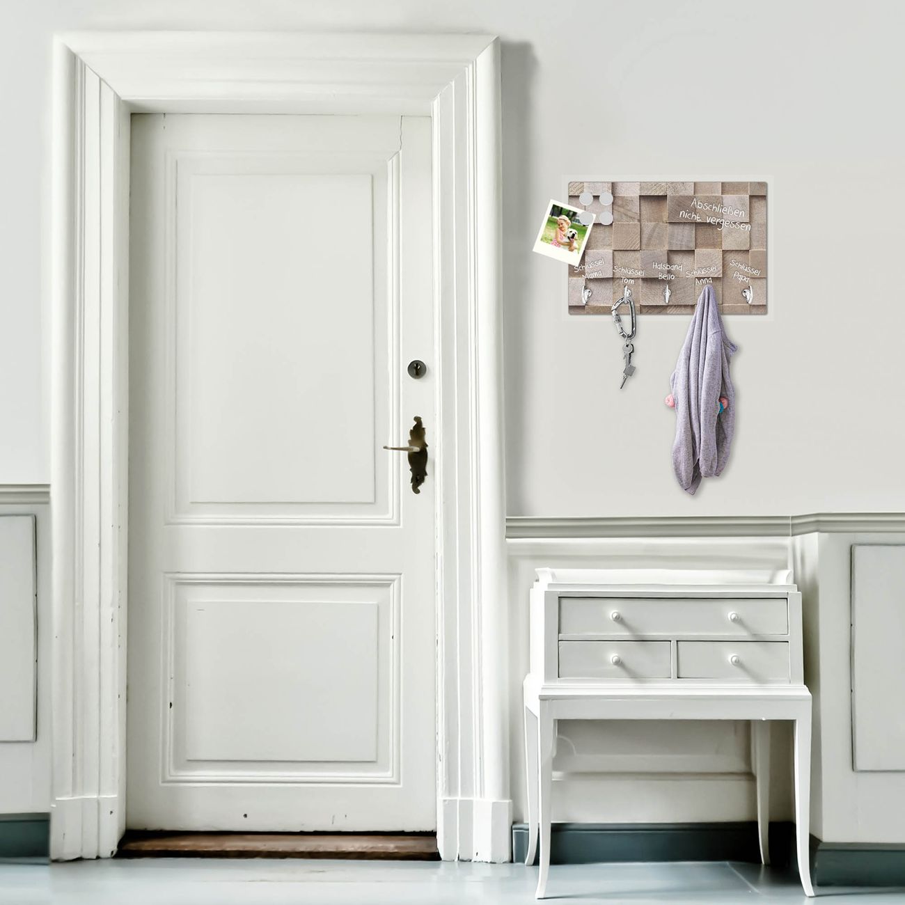 FUNKTION: Mit dem banjado Schlüsselbrett Bauklötze Relief hat Ihre Suche nach dem Schlüsselbund endlich ein Ende! Auf gesamt 5 Haken finden auch die größten Schlüssel ihren Platz. Durch den farbenfrohen Motivdruck ist das Schlüsselboard ein Blickfang in jeder Wohnung. DESIGN: Die Schlüsselleiste mit Motiv Bauklötze Relief hat ein sehr ansprechendes und ausgefallenes Design. Das Glasboard besteht aus einer gehärteten Glasscheibe mit dem Motiv Ihrer Wahl. Ihre neue Schlüsselaufbewahrung ist funktionell und ein optisches Highlight. DETAILS: Das Schlüsselbrett ist 30 x 20 x 4,5 CM (BxHxT). Das ganze Board besteht aus gehärtetem Sicherheitsglas, die Haken zur Selbstmontage präsentieren sich in Edelstahl-Optik. Für einen sicheren Halt erfolgt die Aufhängung an 2 vorgefertigten Haltern an der Rückseite. Das Montagematerial fügen wir bei. NUTZEN: Hier findet alles seinen Platz: Schlüsselbunde, Geschirrtücher, Hundeleinen oder Kinderjacken. Das Glas kann mit Kreidestiften bzw. Whiteboard-Marker beschrieben werden, mit extrastarken Neodym-Magneten können Sie auch Notizen anheften. BANJADO: Wir sind ein kleines Team aus dem Herzen von Sachsen und fertigen Ihre neue Schlüsselaufbewahrung von Hand an. Sie erhalten Handarbeit und keine preiswerte Importware. Wir hoffen, dass Ihnen unsere Idee zusagt, herzlichst das banjado Team.