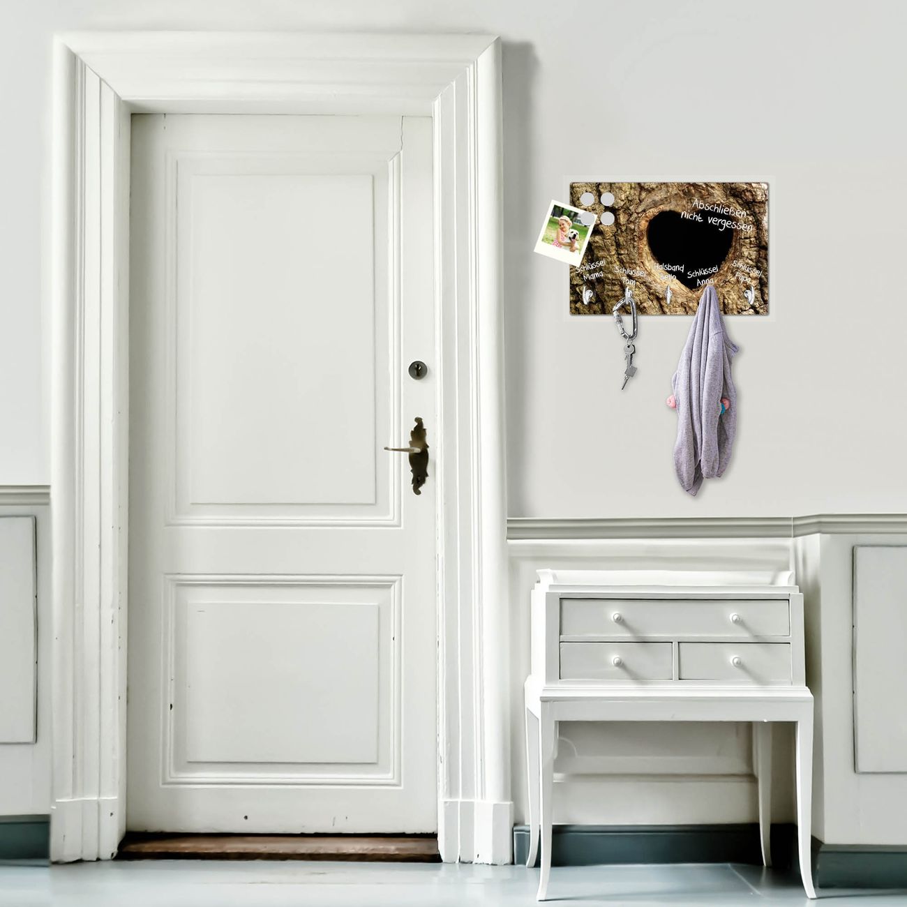 FUNKTION: Mit dem banjado Schlüsselbrett Baumherz hat Ihre Suche nach dem Schlüsselbund endlich ein Ende! Auf gesamt 5 Haken finden auch die größten Schlüssel ihren Platz. Durch den farbenfrohen Motivdruck ist das Schlüsselboard ein Blickfang in jeder Wohnung. DESIGN: Die Schlüsselleiste mit Motiv Baumherz hat ein sehr ansprechendes und ausgefallenes Design. Das Glasboard besteht aus einer gehärteten Glasscheibe mit dem Motiv Ihrer Wahl. Ihre neue Schlüsselaufbewahrung ist funktionell und ein optisches Highlight. DETAILS: Das Schlüsselbrett ist 30 x 20 x 4,5 CM (BxHxT). Das ganze Board besteht aus gehärtetem Sicherheitsglas, die Haken zur Selbstmontage präsentieren sich in Edelstahl-Optik. Für einen sicheren Halt erfolgt die Aufhängung an 2 vorgefertigten Haltern an der Rückseite. Das Montagematerial fügen wir bei. NUTZEN: Hier findet alles seinen Platz: Schlüsselbunde, Geschirrtücher, Hundeleinen oder Kinderjacken. Das Glas kann mit Kreidestiften bzw. Whiteboard-Marker beschrieben werden, mit extrastarken Neodym-Magneten können Sie auch Notizen anheften. BANJADO: Wir sind ein kleines Team aus dem Herzen von Sachsen und fertigen Ihre neue Schlüsselaufbewahrung von Hand an. Sie erhalten Handarbeit und keine preiswerte Importware. Wir hoffen, dass Ihnen unsere Idee zusagt, herzlichst das banjado Team.
