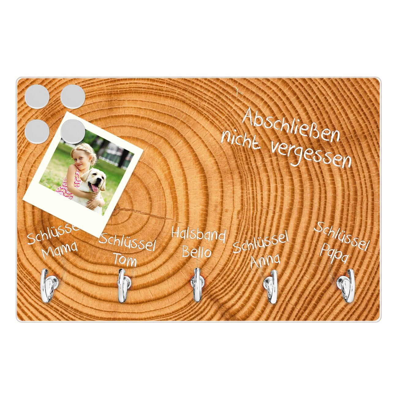 FUNKTION: Mit dem banjado Schlüsselbrett Baumstamm hat Ihre Suche nach dem Schlüsselbund endlich ein Ende! Auf gesamt 5 Haken finden auch die größten Schlüssel ihren Platz. Durch den farbenfrohen Motivdruck ist das Schlüsselboard ein Blickfang in jeder Wohnung. DESIGN: Die Schlüsselleiste mit Motiv Baumstamm hat ein sehr ansprechendes und ausgefallenes Design. Das Glasboard besteht aus einer gehärteten Glasscheibe mit dem Motiv Ihrer Wahl. Ihre neue Schlüsselaufbewahrung ist funktionell und ein optisches Highlight. DETAILS: Das Schlüsselbrett ist 30 x 20 x 4,5 CM (BxHxT). Das ganze Board besteht aus gehärtetem Sicherheitsglas, die Haken zur Selbstmontage präsentieren sich in Edelstahl-Optik. Für einen sicheren Halt erfolgt die Aufhängung an 2 vorgefertigten Haltern an der Rückseite. Das Montagematerial fügen wir bei. NUTZEN: Hier findet alles seinen Platz: Schlüsselbunde, Geschirrtücher, Hundeleinen oder Kinderjacken. Das Glas kann mit Kreidestiften bzw. Whiteboard-Marker beschrieben werden, mit extrastarken Neodym-Magneten können Sie auch Notizen anheften. BANJADO: Wir sind ein kleines Team aus dem Herzen von Sachsen und fertigen Ihre neue Schlüsselaufbewahrung von Hand an. Sie erhalten Handarbeit und keine preiswerte Importware. Wir hoffen, dass Ihnen unsere Idee zusagt, herzlichst das banjado Team.