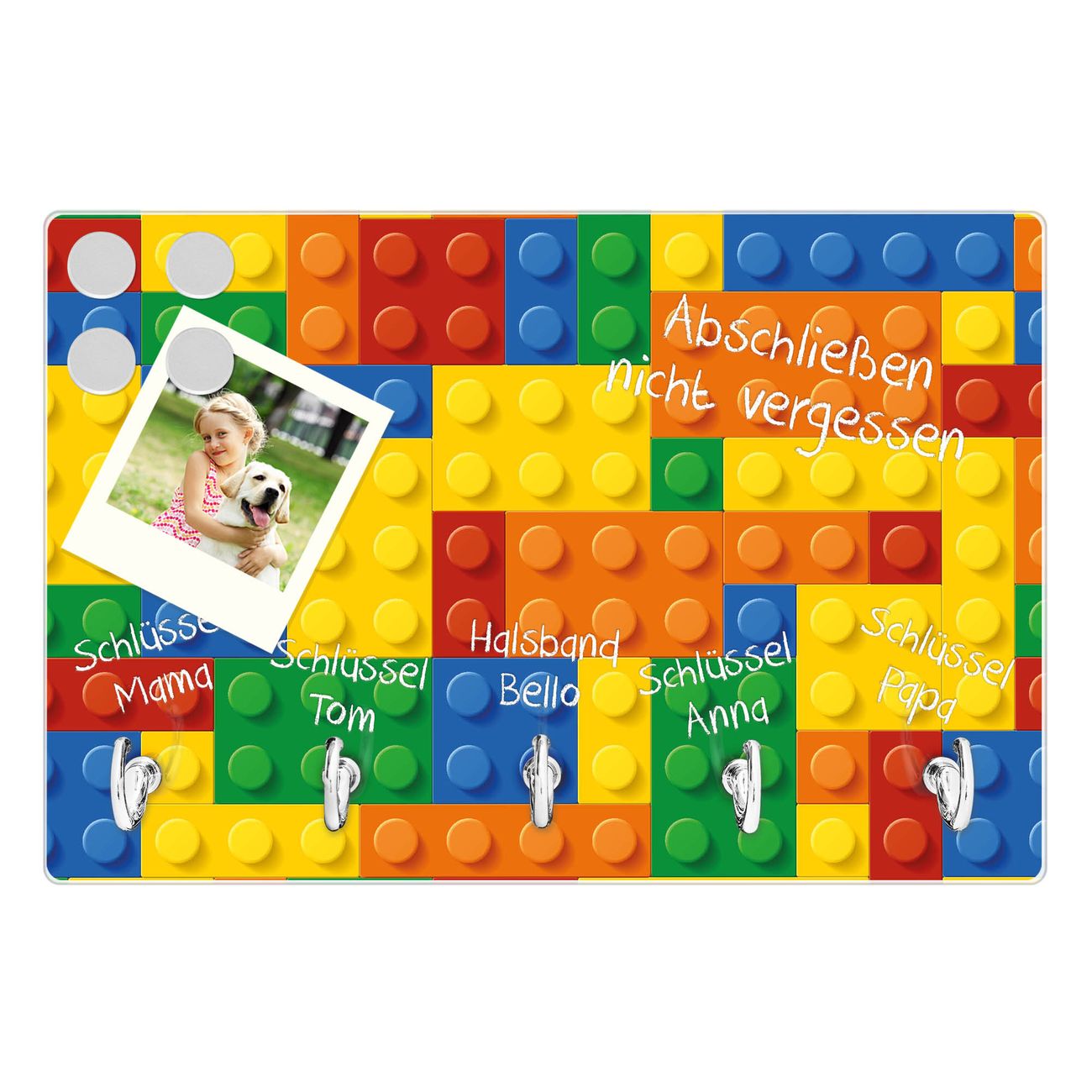 FUNKTION: Mit dem banjado Schlüsselbrett Bausteine hat Ihre Suche nach dem Schlüsselbund endlich ein Ende! Auf gesamt 5 Haken finden auch die größten Schlüssel ihren Platz. Durch den farbenfrohen Motivdruck ist das Schlüsselboard ein Blickfang in jeder Wohnung. DESIGN: Die Schlüsselleiste mit Motiv Bausteine hat ein sehr ansprechendes und ausgefallenes Design. Das Glasboard besteht aus einer gehärteten Glasscheibe mit dem Motiv Ihrer Wahl. Ihre neue Schlüsselaufbewahrung ist funktionell und ein optisches Highlight. DETAILS: Das Schlüsselbrett ist 30 x 20 x 4,5 CM (BxHxT). Das ganze Board besteht aus gehärtetem Sicherheitsglas, die Haken zur Selbstmontage präsentieren sich in Edelstahl-Optik. Für einen sicheren Halt erfolgt die Aufhängung an 2 vorgefertigten Haltern an der Rückseite. Das Montagematerial fügen wir bei. NUTZEN: Hier findet alles seinen Platz: Schlüsselbunde, Geschirrtücher, Hundeleinen oder Kinderjacken. Das Glas kann mit Kreidestiften bzw. Whiteboard-Marker beschrieben werden, mit extrastarken Neodym-Magneten können Sie auch Notizen anheften. BANJADO: Wir sind ein kleines Team aus dem Herzen von Sachsen und fertigen Ihre neue Schlüsselaufbewahrung von Hand an. Sie erhalten Handarbeit und keine preiswerte Importware. Wir hoffen, dass Ihnen unsere Idee zusagt, herzlichst das banjado Team.