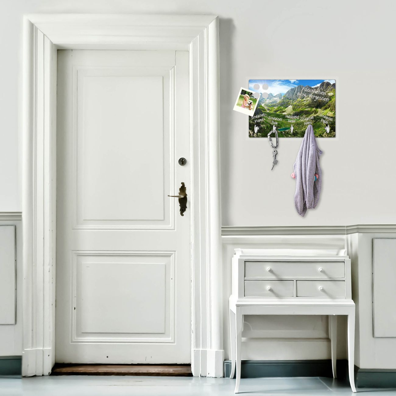 FUNKTION: Mit dem banjado Schlüsselbrett Bergsee Alpen hat Ihre Suche nach dem Schlüsselbund endlich ein Ende! Auf gesamt 5 Haken finden auch die größten Schlüssel ihren Platz. Durch den farbenfrohen Motivdruck ist das Schlüsselboard ein Blickfang in jeder Wohnung. DESIGN: Die Schlüsselleiste mit Motiv Bergsee Alpen hat ein sehr ansprechendes und ausgefallenes Design. Das Glasboard besteht aus einer gehärteten Glasscheibe mit dem Motiv Ihrer Wahl. Ihre neue Schlüsselaufbewahrung ist funktionell und ein optisches Highlight. DETAILS: Das Schlüsselbrett ist 30 x 20 x 4,5 CM (BxHxT). Das ganze Board besteht aus gehärtetem Sicherheitsglas, die Haken zur Selbstmontage präsentieren sich in Edelstahl-Optik. Für einen sicheren Halt erfolgt die Aufhängung an 2 vorgefertigten Haltern an der Rückseite. Das Montagematerial fügen wir bei. NUTZEN: Hier findet alles seinen Platz: Schlüsselbunde, Geschirrtücher, Hundeleinen oder Kinderjacken. Das Glas kann mit Kreidestiften bzw. Whiteboard-Marker beschrieben werden, mit extrastarken Neodym-Magneten können Sie auch Notizen anheften. BANJADO: Wir sind ein kleines Team aus dem Herzen von Sachsen und fertigen Ihre neue Schlüsselaufbewahrung von Hand an. Sie erhalten Handarbeit und keine preiswerte Importware. Wir hoffen, dass Ihnen unsere Idee zusagt, herzlichst das banjado Team.