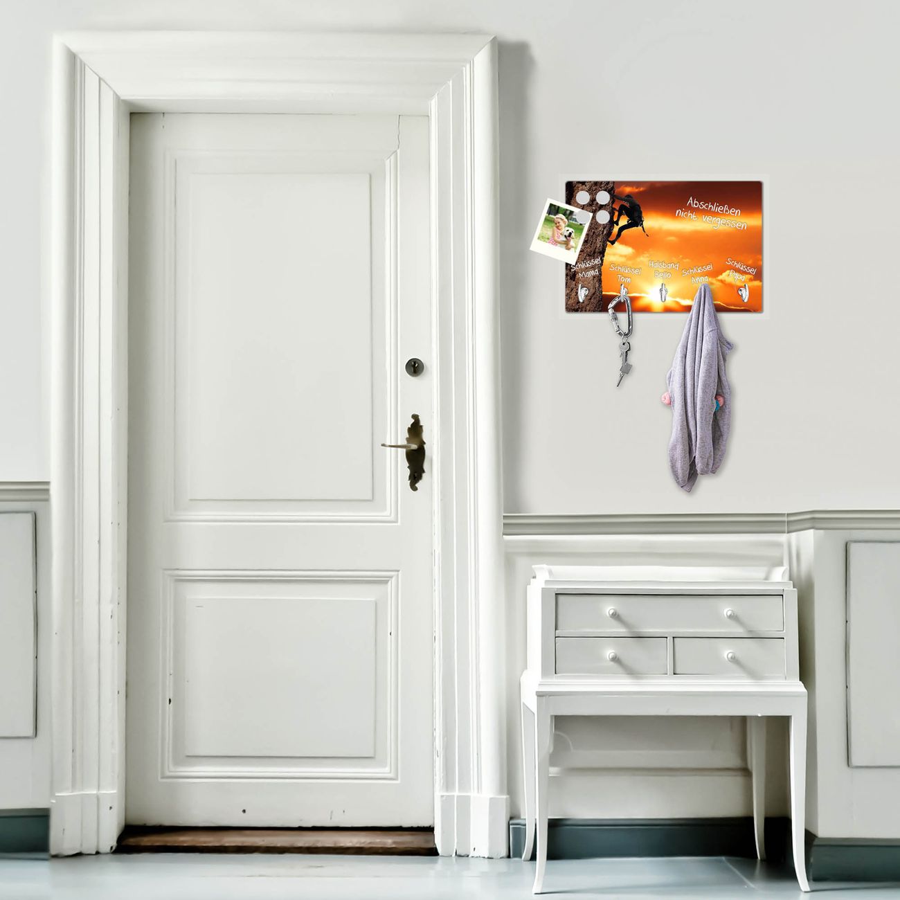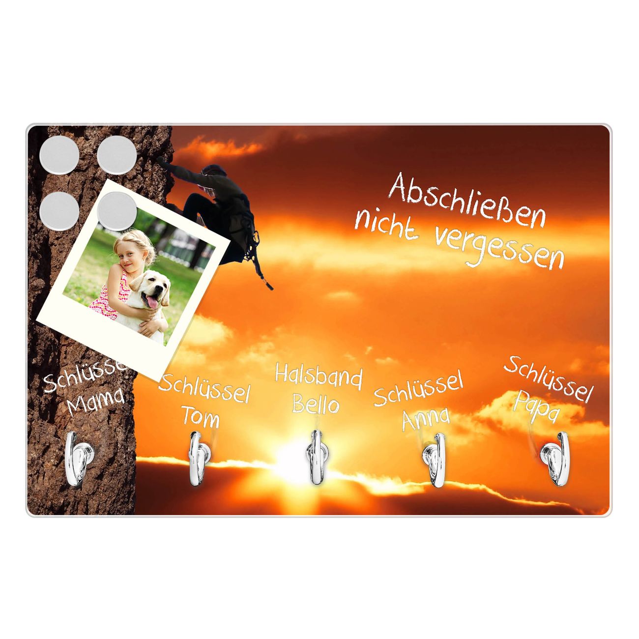 FUNKTION: Mit dem banjado Schlüsselbrett Bergsteiger hat Ihre Suche nach dem Schlüsselbund endlich ein Ende! Auf gesamt 5 Haken finden auch die größten Schlüssel ihren Platz. Durch den farbenfrohen Motivdruck ist das Schlüsselboard ein Blickfang in jeder Wohnung. DESIGN: Die Schlüsselleiste mit Motiv Bergsteiger hat ein sehr ansprechendes und ausgefallenes Design. Das Glasboard besteht aus einer gehärteten Glasscheibe mit dem Motiv Ihrer Wahl. Ihre neue Schlüsselaufbewahrung ist funktionell und ein optisches Highlight. DETAILS: Das Schlüsselbrett ist 30 x 20 x 4,5 CM (BxHxT). Das ganze Board besteht aus gehärtetem Sicherheitsglas, die Haken zur Selbstmontage präsentieren sich in Edelstahl-Optik. Für einen sicheren Halt erfolgt die Aufhängung an 2 vorgefertigten Haltern an der Rückseite. Das Montagematerial fügen wir bei. NUTZEN: Hier findet alles seinen Platz: Schlüsselbunde, Geschirrtücher, Hundeleinen oder Kinderjacken. Das Glas kann mit Kreidestiften bzw. Whiteboard-Marker beschrieben werden, mit extrastarken Neodym-Magneten können Sie auch Notizen anheften. BANJADO: Wir sind ein kleines Team aus dem Herzen von Sachsen und fertigen Ihre neue Schlüsselaufbewahrung von Hand an. Sie erhalten Handarbeit und keine preiswerte Importware. Wir hoffen, dass Ihnen unsere Idee zusagt, herzlichst das banjado Team.