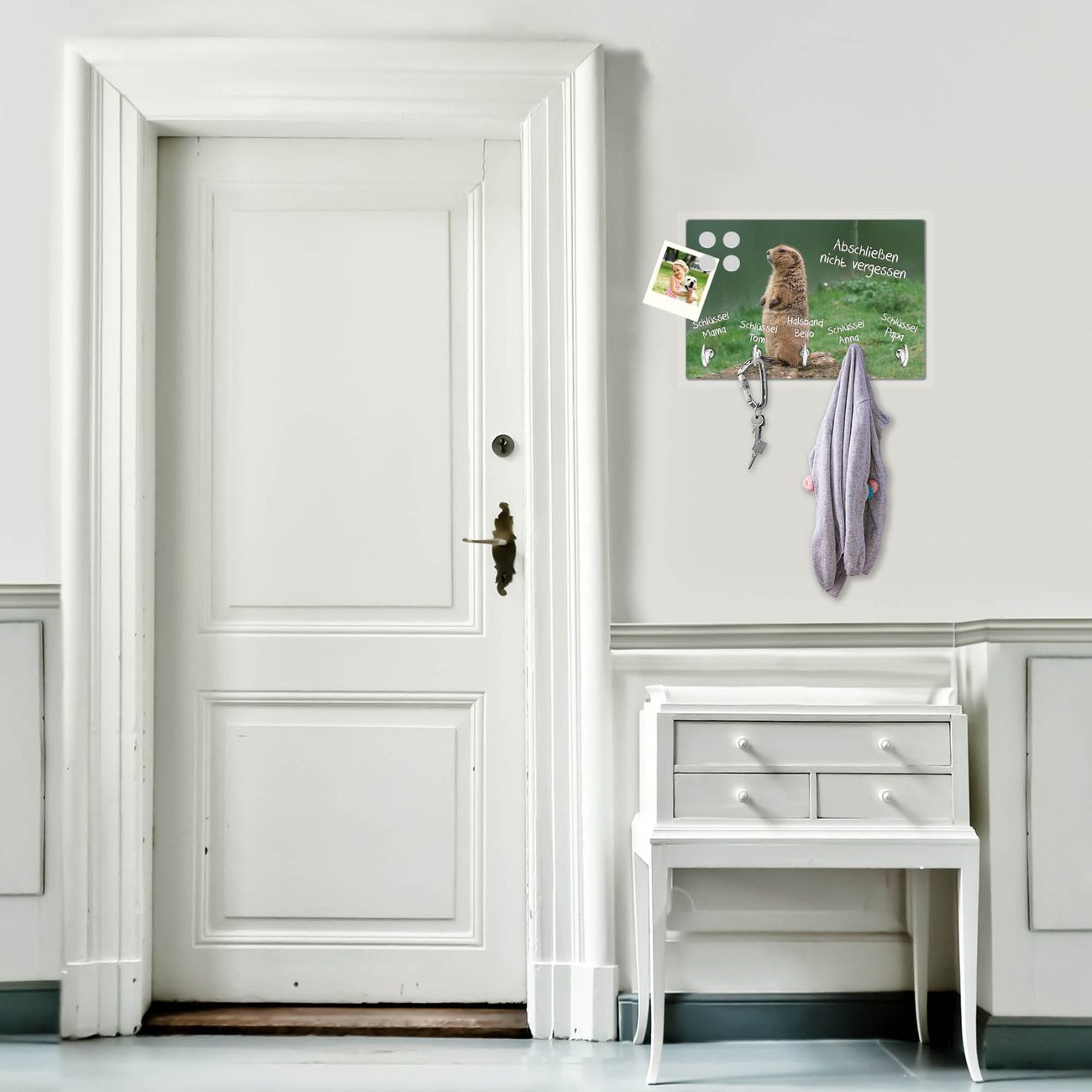 FUNKTION: Mit dem banjado Schlüsselbrett Biber hat Ihre Suche nach dem Schlüsselbund endlich ein Ende! Auf gesamt 5 Haken finden auch die größten Schlüssel ihren Platz. Durch den farbenfrohen Motivdruck ist das Schlüsselboard ein Blickfang in jeder Wohnung. DESIGN: Die Schlüsselleiste mit Motiv Biber hat ein sehr ansprechendes und ausgefallenes Design. Das Glasboard besteht aus einer gehärteten Glasscheibe mit dem Motiv Ihrer Wahl. Ihre neue Schlüsselaufbewahrung ist funktionell und ein optisches Highlight. DETAILS: Das Schlüsselbrett ist 30 x 20 x 4,5 CM (BxHxT). Das ganze Board besteht aus gehärtetem Sicherheitsglas, die Haken zur Selbstmontage präsentieren sich in Edelstahl-Optik. Für einen sicheren Halt erfolgt die Aufhängung an 2 vorgefertigten Haltern an der Rückseite. Das Montagematerial fügen wir bei. NUTZEN: Hier findet alles seinen Platz: Schlüsselbunde, Geschirrtücher, Hundeleinen oder Kinderjacken. Das Glas kann mit Kreidestiften bzw. Whiteboard-Marker beschrieben werden, mit extrastarken Neodym-Magneten können Sie auch Notizen anheften. BANJADO: Wir sind ein kleines Team aus dem Herzen von Sachsen und fertigen Ihre neue Schlüsselaufbewahrung von Hand an. Sie erhalten Handarbeit und keine preiswerte Importware. Wir hoffen, dass Ihnen unsere Idee zusagt, herzlichst das banjado Team.
