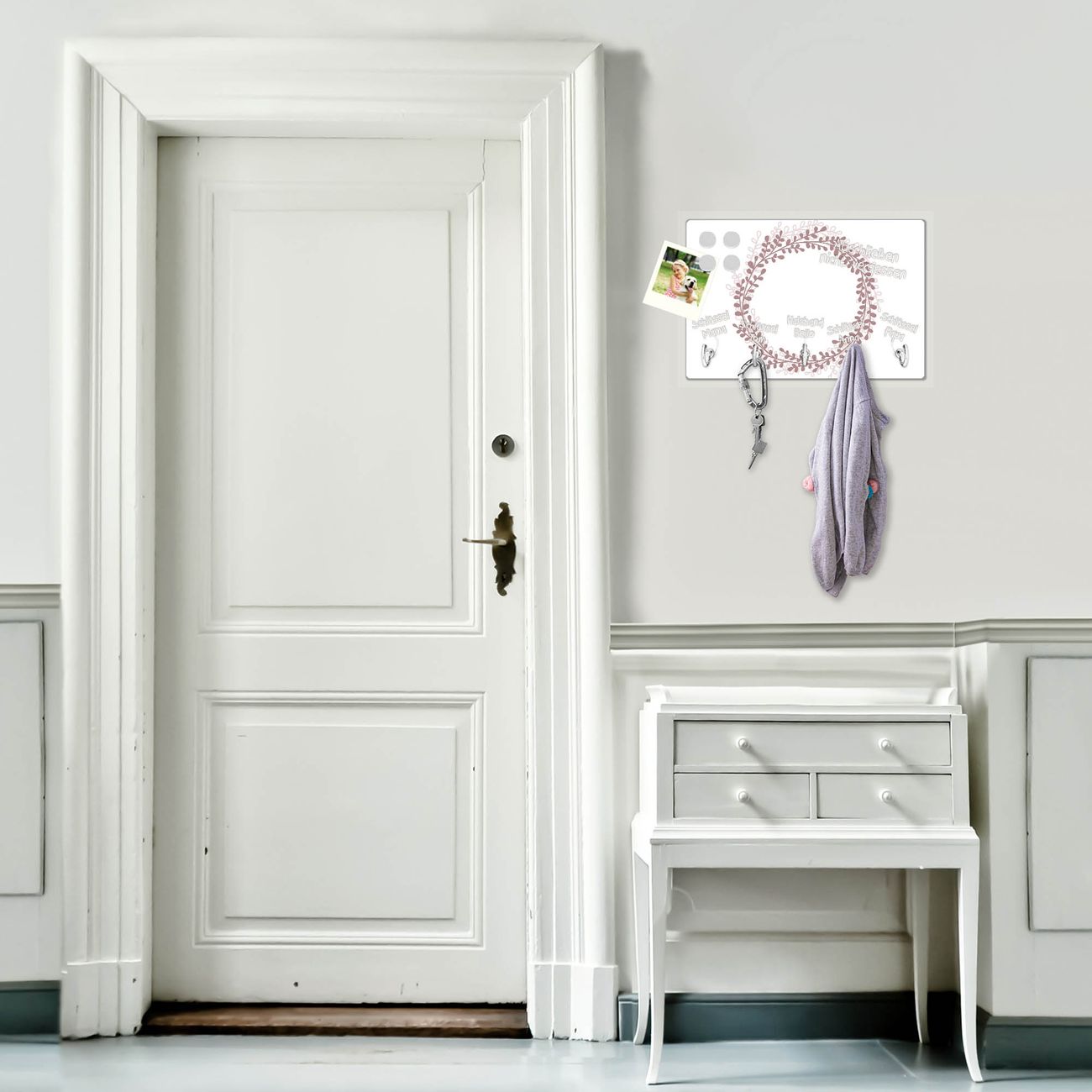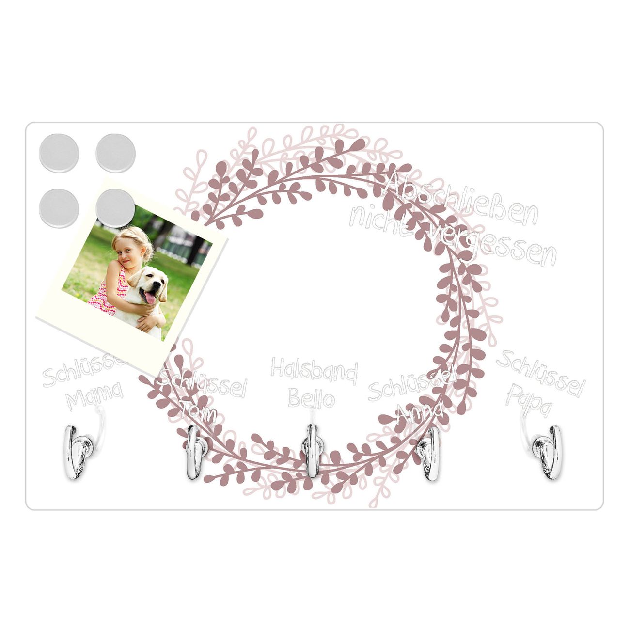 FUNKTION: Mit dem banjado Schlüsselbrett Blätterkranz hat Ihre Suche nach dem Schlüsselbund endlich ein Ende! Auf gesamt 5 Haken finden auch die größten Schlüssel ihren Platz. Durch den farbenfrohen Motivdruck ist das Schlüsselboard ein Blickfang in jeder Wohnung. DESIGN: Die Schlüsselleiste mit Motiv Blätterkranz hat ein sehr ansprechendes und ausgefallenes Design. Das Glasboard besteht aus einer gehärteten Glasscheibe mit dem Motiv Ihrer Wahl. Ihre neue Schlüsselaufbewahrung ist funktionell und ein optisches Highlight. DETAILS: Das Schlüsselbrett ist 30 x 20 x 4,5 CM (BxHxT). Das ganze Board besteht aus gehärtetem Sicherheitsglas, die Haken zur Selbstmontage präsentieren sich in Edelstahl-Optik. Für einen sicheren Halt erfolgt die Aufhängung an 2 vorgefertigten Haltern an der Rückseite. Das Montagematerial fügen wir bei. NUTZEN: Hier findet alles seinen Platz: Schlüsselbunde, Geschirrtücher, Hundeleinen oder Kinderjacken. Das Glas kann mit Kreidestiften bzw. Whiteboard-Marker beschrieben werden, mit extrastarken Neodym-Magneten können Sie auch Notizen anheften. BANJADO: Wir sind ein kleines Team aus dem Herzen von Sachsen und fertigen Ihre neue Schlüsselaufbewahrung von Hand an. Sie erhalten Handarbeit und keine preiswerte Importware. Wir hoffen, dass Ihnen unsere Idee zusagt, herzlichst das banjado Team.