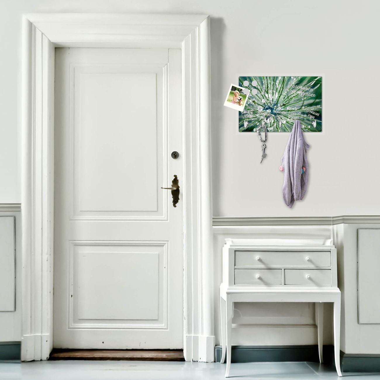 FUNKTION: Mit dem banjado Schlüsselbrett Blüte Mit Tautropfen hat Ihre Suche nach dem Schlüsselbund endlich ein Ende! Auf gesamt 5 Haken finden auch die größten Schlüssel ihren Platz. Durch den farbenfrohen Motivdruck ist das Schlüsselboard ein Blickfang in jeder Wohnung. DESIGN: Die Schlüsselleiste mit Motiv Blüte Mit Tautropfen hat ein sehr ansprechendes und ausgefallenes Design. Das Glasboard besteht aus einer gehärteten Glasscheibe mit dem Motiv Ihrer Wahl. Ihre neue Schlüsselaufbewahrung ist funktionell und ein optisches Highlight. DETAILS: Das Schlüsselbrett ist 30 x 20 x 4,5 CM (BxHxT). Das ganze Board besteht aus gehärtetem Sicherheitsglas, die Haken zur Selbstmontage präsentieren sich in Edelstahl-Optik. Für einen sicheren Halt erfolgt die Aufhängung an 2 vorgefertigten Haltern an der Rückseite. Das Montagematerial fügen wir bei. NUTZEN: Hier findet alles seinen Platz: Schlüsselbunde, Geschirrtücher, Hundeleinen oder Kinderjacken. Das Glas kann mit Kreidestiften bzw. Whiteboard-Marker beschrieben werden, mit extrastarken Neodym-Magneten können Sie auch Notizen anheften. BANJADO: Wir sind ein kleines Team aus dem Herzen von Sachsen und fertigen Ihre neue Schlüsselaufbewahrung von Hand an. Sie erhalten Handarbeit und keine preiswerte Importware. Wir hoffen, dass Ihnen unsere Idee zusagt, herzlichst das banjado Team.