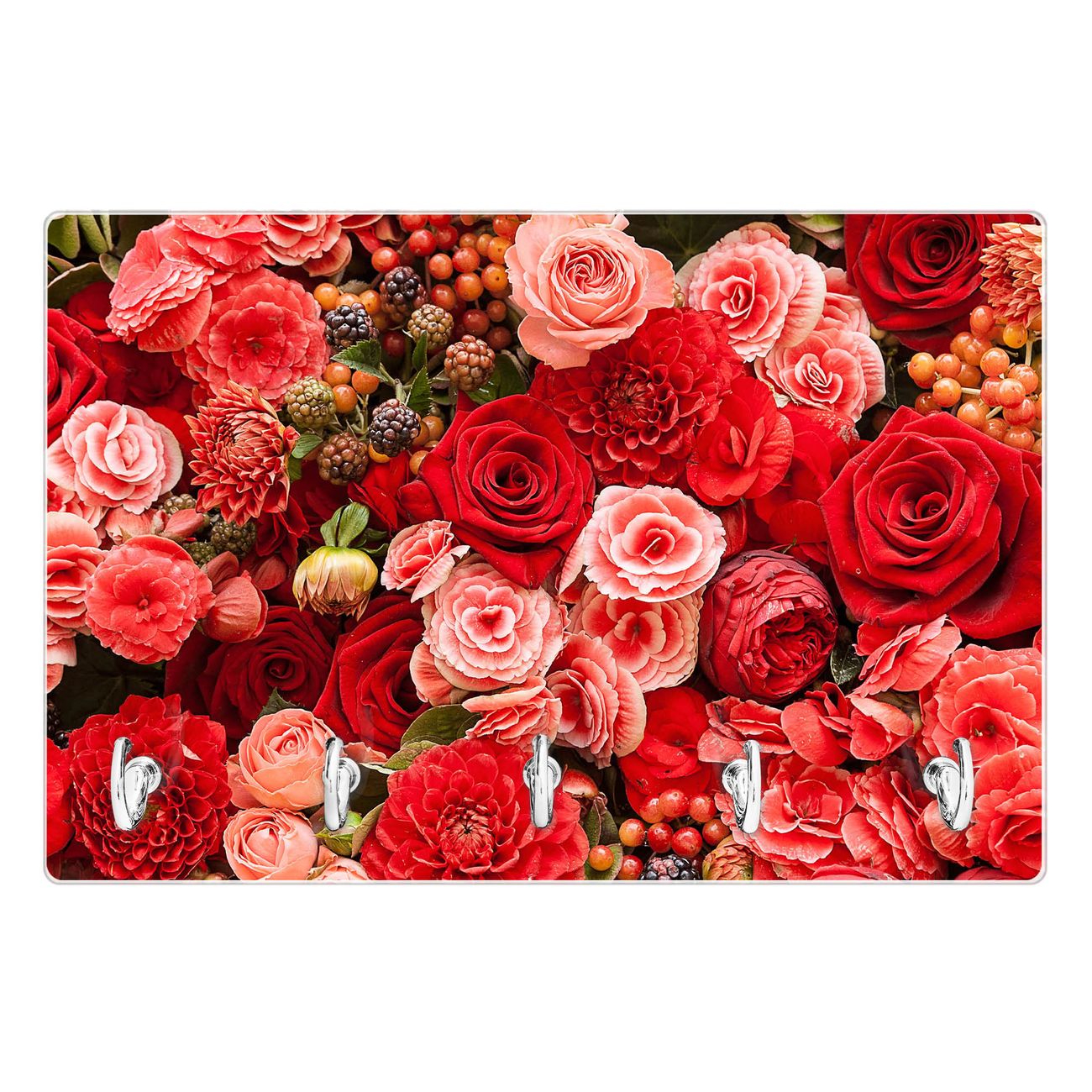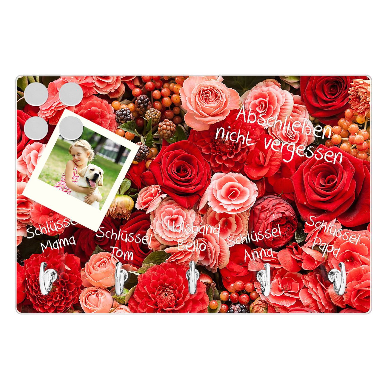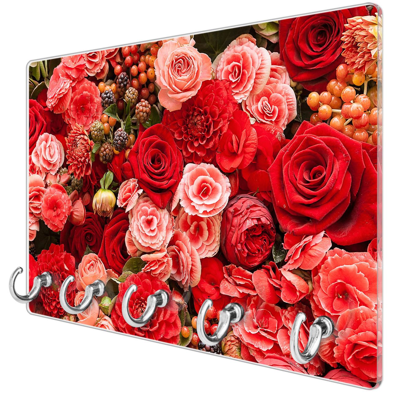 Glas Schlüsselbrett mit 5 Haken Bouquet in Rot