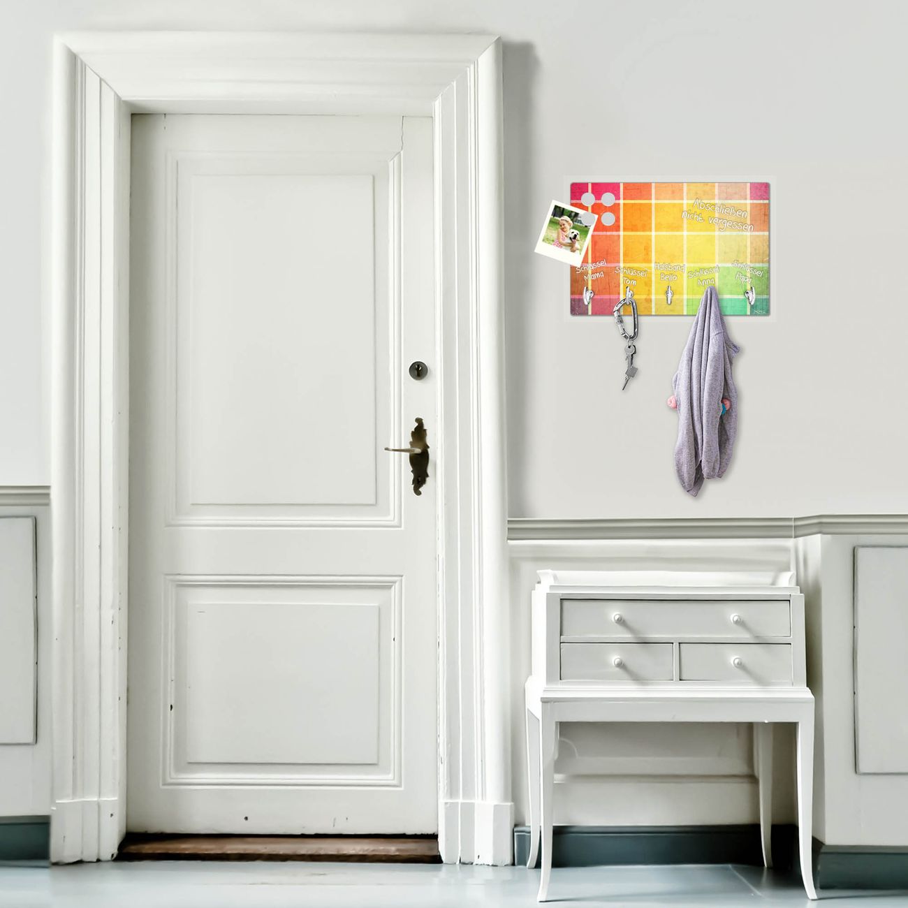 FUNKTION: Mit dem banjado Schlüsselbrett Bunte Glasbausteine hat Ihre Suche nach dem Schlüsselbund endlich ein Ende! Auf gesamt 5 Haken finden auch die größten Schlüssel ihren Platz. Durch den farbenfrohen Motivdruck ist das Schlüsselboard ein Blickfang in jeder Wohnung. DESIGN: Die Schlüsselleiste mit Motiv Bunte Glasbausteine hat ein sehr ansprechendes und ausgefallenes Design. Das Glasboard besteht aus einer gehärteten Glasscheibe mit dem Motiv Ihrer Wahl. Ihre neue Schlüsselaufbewahrung ist funktionell und ein optisches Highlight. DETAILS: Das Schlüsselbrett ist 30 x 20 x 4,5 CM (BxHxT). Das ganze Board besteht aus gehärtetem Sicherheitsglas, die Haken zur Selbstmontage präsentieren sich in Edelstahl-Optik. Für einen sicheren Halt erfolgt die Aufhängung an 2 vorgefertigten Haltern an der Rückseite. Das Montagematerial fügen wir bei. NUTZEN: Hier findet alles seinen Platz: Schlüsselbunde, Geschirrtücher, Hundeleinen oder Kinderjacken. Das Glas kann mit Kreidestiften bzw. Whiteboard-Marker beschrieben werden, mit extrastarken Neodym-Magneten können Sie auch Notizen anheften. BANJADO: Wir sind ein kleines Team aus dem Herzen von Sachsen und fertigen Ihre neue Schlüsselaufbewahrung von Hand an. Sie erhalten Handarbeit und keine preiswerte Importware. Wir hoffen, dass Ihnen unsere Idee zusagt, herzlichst das banjado Team.