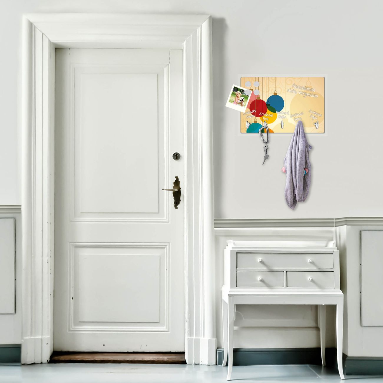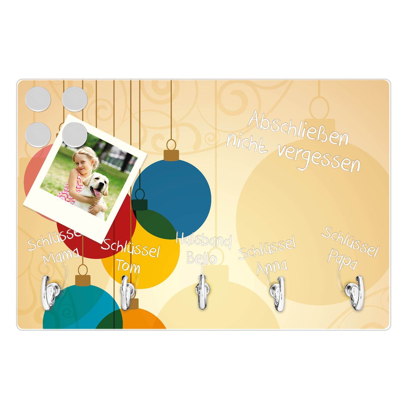 FUNKTION: Mit dem banjado Schlüsselbrett Bunte Kugeln hat Ihre Suche nach dem Schlüsselbund endlich ein Ende! Auf gesamt 5 Haken finden auch die größten Schlüssel ihren Platz. Durch den farbenfrohen Motivdruck ist das Schlüsselboard ein Blickfang in jeder Wohnung. DESIGN: Die Schlüsselleiste mit Motiv Bunte Kugeln hat ein sehr ansprechendes und ausgefallenes Design. Das Glasboard besteht aus einer gehärteten Glasscheibe mit dem Motiv Ihrer Wahl. Ihre neue Schlüsselaufbewahrung ist funktionell und ein optisches Highlight. DETAILS: Das Schlüsselbrett ist 30 x 20 x 4,5 CM (BxHxT). Das ganze Board besteht aus gehärtetem Sicherheitsglas, die Haken zur Selbstmontage präsentieren sich in Edelstahl-Optik. Für einen sicheren Halt erfolgt die Aufhängung an 2 vorgefertigten Haltern an der Rückseite. Das Montagematerial fügen wir bei. NUTZEN: Hier findet alles seinen Platz: Schlüsselbunde, Geschirrtücher, Hundeleinen oder Kinderjacken. Das Glas kann mit Kreidestiften bzw. Whiteboard-Marker beschrieben werden, mit extrastarken Neodym-Magneten können Sie auch Notizen anheften. BANJADO: Wir sind ein kleines Team aus dem Herzen von Sachsen und fertigen Ihre neue Schlüsselaufbewahrung von Hand an. Sie erhalten Handarbeit und keine preiswerte Importware. Wir hoffen, dass Ihnen unsere Idee zusagt, herzlichst das banjado Team.