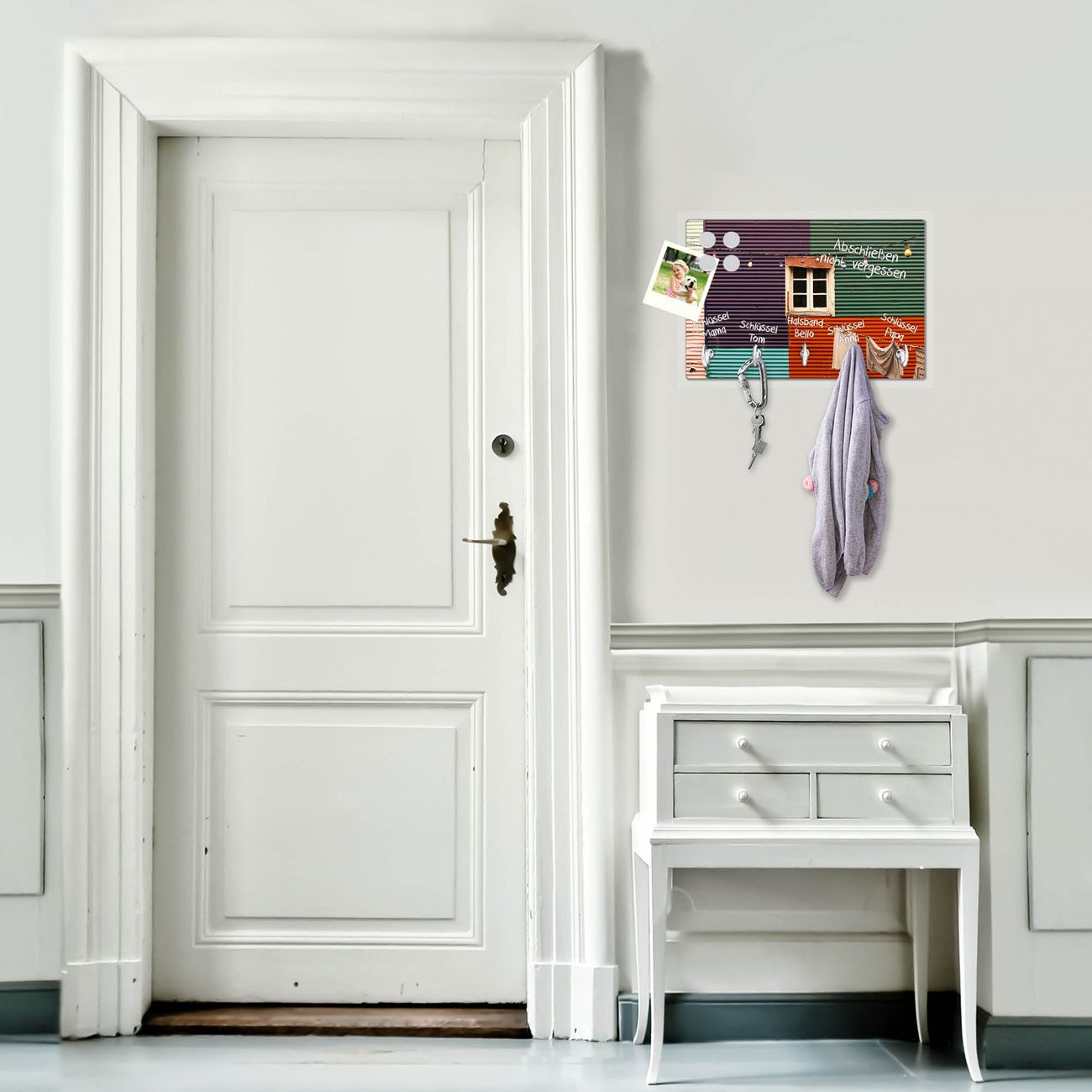 FUNKTION: Mit dem banjado Schlüsselbrett Buntes Haus hat Ihre Suche nach dem Schlüsselbund endlich ein Ende! Auf gesamt 5 Haken finden auch die größten Schlüssel ihren Platz. Durch den farbenfrohen Motivdruck ist das Schlüsselboard ein Blickfang in jeder Wohnung. DESIGN: Die Schlüsselleiste mit Motiv Buntes Haus hat ein sehr ansprechendes und ausgefallenes Design. Das Glasboard besteht aus einer gehärteten Glasscheibe mit dem Motiv Ihrer Wahl. Ihre neue Schlüsselaufbewahrung ist funktionell und ein optisches Highlight. DETAILS: Das Schlüsselbrett ist 30 x 20 x 4,5 CM (BxHxT). Das ganze Board besteht aus gehärtetem Sicherheitsglas, die Haken zur Selbstmontage präsentieren sich in Edelstahl-Optik. Für einen sicheren Halt erfolgt die Aufhängung an 2 vorgefertigten Haltern an der Rückseite. Das Montagematerial fügen wir bei. NUTZEN: Hier findet alles seinen Platz: Schlüsselbunde, Geschirrtücher, Hundeleinen oder Kinderjacken. Das Glas kann mit Kreidestiften bzw. Whiteboard-Marker beschrieben werden, mit extrastarken Neodym-Magneten können Sie auch Notizen anheften. BANJADO: Wir sind ein kleines Team aus dem Herzen von Sachsen und fertigen Ihre neue Schlüsselaufbewahrung von Hand an. Sie erhalten Handarbeit und keine preiswerte Importware. Wir hoffen, dass Ihnen unsere Idee zusagt, herzlichst das banjado Team.
