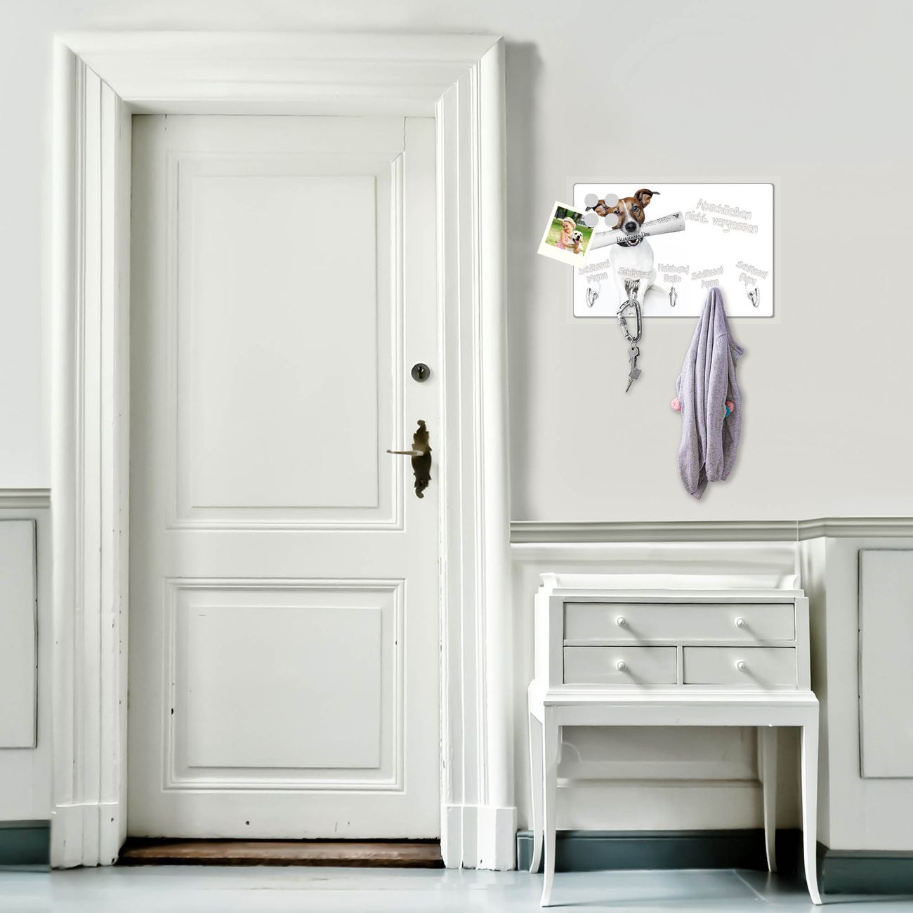 FUNKTION: Mit dem banjado Schlüsselbrett Business Day hat Ihre Suche nach dem Schlüsselbund endlich ein Ende! Auf gesamt 5 Haken finden auch die größten Schlüssel ihren Platz. Durch den farbenfrohen Motivdruck ist das Schlüsselboard ein Blickfang in jeder Wohnung. DESIGN: Die Schlüsselleiste mit Motiv Business Day hat ein sehr ansprechendes und ausgefallenes Design. Das Glasboard besteht aus einer gehärteten Glasscheibe mit dem Motiv Ihrer Wahl. Ihre neue Schlüsselaufbewahrung ist funktionell und ein optisches Highlight. DETAILS: Das Schlüsselbrett ist 30 x 20 x 4,5 CM (BxHxT). Das ganze Board besteht aus gehärtetem Sicherheitsglas, die Haken zur Selbstmontage präsentieren sich in Edelstahl-Optik. Für einen sicheren Halt erfolgt die Aufhängung an 2 vorgefertigten Haltern an der Rückseite. Das Montagematerial fügen wir bei. NUTZEN: Hier findet alles seinen Platz: Schlüsselbunde, Geschirrtücher, Hundeleinen oder Kinderjacken. Das Glas kann mit Kreidestiften bzw. Whiteboard-Marker beschrieben werden, mit extrastarken Neodym-Magneten können Sie auch Notizen anheften. BANJADO: Wir sind ein kleines Team aus dem Herzen von Sachsen und fertigen Ihre neue Schlüsselaufbewahrung von Hand an. Sie erhalten Handarbeit und keine preiswerte Importware. Wir hoffen, dass Ihnen unsere Idee zusagt, herzlichst das banjado Team.