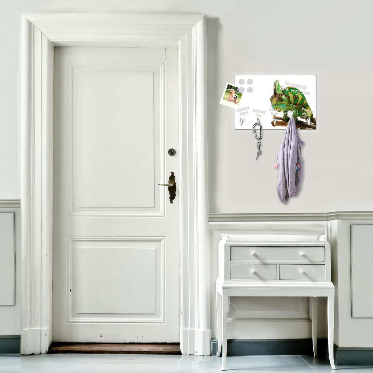 FUNKTION: Mit dem banjado Schlüsselbrett Chamäleon hat Ihre Suche nach dem Schlüsselbund endlich ein Ende! Auf gesamt 5 Haken finden auch die größten Schlüssel ihren Platz. Durch den farbenfrohen Motivdruck ist das Schlüsselboard ein Blickfang in jeder Wohnung. DESIGN: Die Schlüsselleiste mit Motiv Chamäleon hat ein sehr ansprechendes und ausgefallenes Design. Das Glasboard besteht aus einer gehärteten Glasscheibe mit dem Motiv Ihrer Wahl. Ihre neue Schlüsselaufbewahrung ist funktionell und ein optisches Highlight. DETAILS: Das Schlüsselbrett ist 30 x 20 x 4,5 CM (BxHxT). Das ganze Board besteht aus gehärtetem Sicherheitsglas, die Haken zur Selbstmontage präsentieren sich in Edelstahl-Optik. Für einen sicheren Halt erfolgt die Aufhängung an 2 vorgefertigten Haltern an der Rückseite. Das Montagematerial fügen wir bei. NUTZEN: Hier findet alles seinen Platz: Schlüsselbunde, Geschirrtücher, Hundeleinen oder Kinderjacken. Das Glas kann mit Kreidestiften bzw. Whiteboard-Marker beschrieben werden, mit extrastarken Neodym-Magneten können Sie auch Notizen anheften. BANJADO: Wir sind ein kleines Team aus dem Herzen von Sachsen und fertigen Ihre neue Schlüsselaufbewahrung von Hand an. Sie erhalten Handarbeit und keine preiswerte Importware. Wir hoffen, dass Ihnen unsere Idee zusagt, herzlichst das banjado Team.