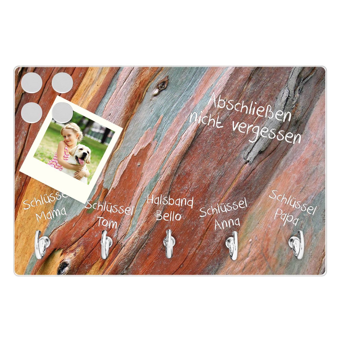 FUNKTION: Mit dem banjado Schlüsselbrett Coloured Wood hat Ihre Suche nach dem Schlüsselbund endlich ein Ende! Auf gesamt 5 Haken finden auch die größten Schlüssel ihren Platz. Durch den farbenfrohen Motivdruck ist das Schlüsselboard ein Blickfang in jeder Wohnung. DESIGN: Die Schlüsselleiste mit Motiv Coloured Wood hat ein sehr ansprechendes und ausgefallenes Design. Das Glasboard besteht aus einer gehärteten Glasscheibe mit dem Motiv Ihrer Wahl. Ihre neue Schlüsselaufbewahrung ist funktionell und ein optisches Highlight. DETAILS: Das Schlüsselbrett ist 30 x 20 x 4,5 CM (BxHxT). Das ganze Board besteht aus gehärtetem Sicherheitsglas, die Haken zur Selbstmontage präsentieren sich in Edelstahl-Optik. Für einen sicheren Halt erfolgt die Aufhängung an 2 vorgefertigten Haltern an der Rückseite. Das Montagematerial fügen wir bei. NUTZEN: Hier findet alles seinen Platz: Schlüsselbunde, Geschirrtücher, Hundeleinen oder Kinderjacken. Das Glas kann mit Kreidestiften bzw. Whiteboard-Marker beschrieben werden, mit extrastarken Neodym-Magneten können Sie auch Notizen anheften. BANJADO: Wir sind ein kleines Team aus dem Herzen von Sachsen und fertigen Ihre neue Schlüsselaufbewahrung von Hand an. Sie erhalten Handarbeit und keine preiswerte Importware. Wir hoffen, dass Ihnen unsere Idee zusagt, herzlichst das banjado Team.