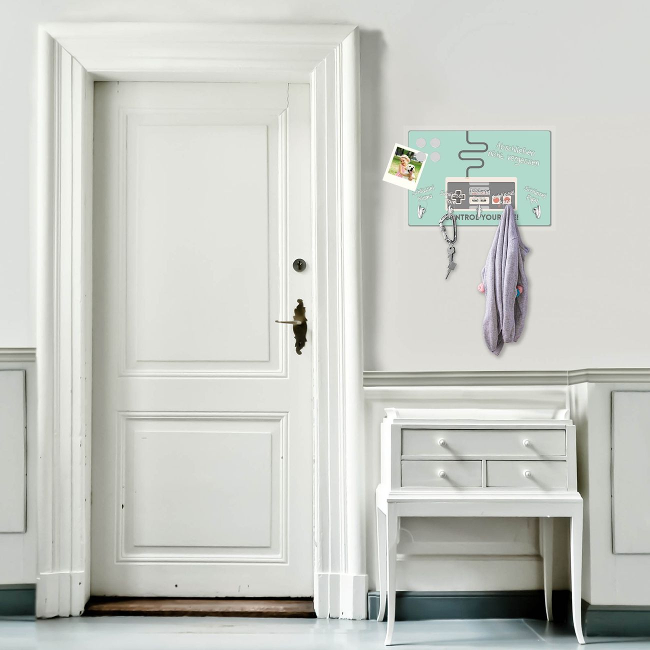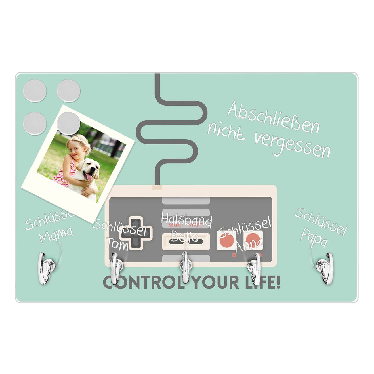 FUNKTION: Mit dem banjado Schlüsselbrett Control hat Ihre Suche nach dem Schlüsselbund endlich ein Ende! Auf gesamt 5 Haken finden auch die größten Schlüssel ihren Platz. Durch den farbenfrohen Motivdruck ist das Schlüsselboard ein Blickfang in jeder Wohnung. DESIGN: Die Schlüsselleiste mit Motiv Control hat ein sehr ansprechendes und ausgefallenes Design. Das Glasboard besteht aus einer gehärteten Glasscheibe mit dem Motiv Ihrer Wahl. Ihre neue Schlüsselaufbewahrung ist funktionell und ein optisches Highlight. DETAILS: Das Schlüsselbrett ist 30 x 20 x 4,5 CM (BxHxT). Das ganze Board besteht aus gehärtetem Sicherheitsglas, die Haken zur Selbstmontage präsentieren sich in Edelstahl-Optik. Für einen sicheren Halt erfolgt die Aufhängung an 2 vorgefertigten Haltern an der Rückseite. Das Montagematerial fügen wir bei. NUTZEN: Hier findet alles seinen Platz: Schlüsselbunde, Geschirrtücher, Hundeleinen oder Kinderjacken. Das Glas kann mit Kreidestiften bzw. Whiteboard-Marker beschrieben werden, mit extrastarken Neodym-Magneten können Sie auch Notizen anheften. BANJADO: Wir sind ein kleines Team aus dem Herzen von Sachsen und fertigen Ihre neue Schlüsselaufbewahrung von Hand an. Sie erhalten Handarbeit und keine preiswerte Importware. Wir hoffen, dass Ihnen unsere Idee zusagt, herzlichst das banjado Team.