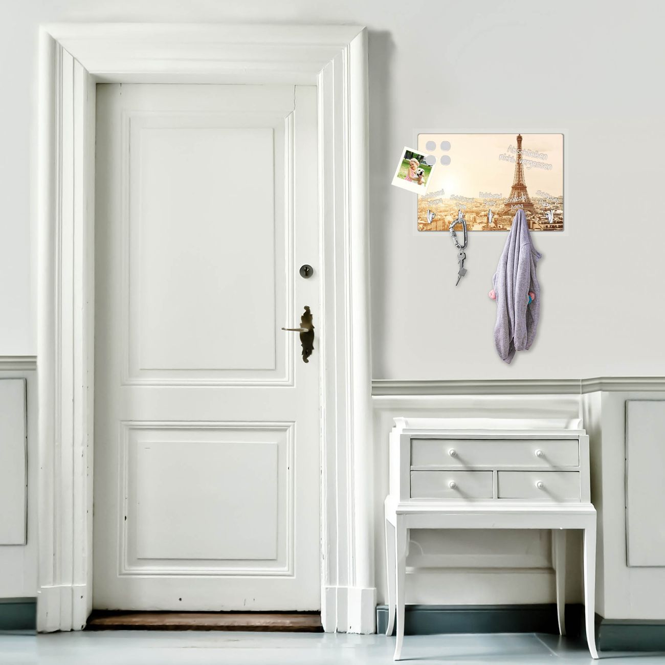 FUNKTION: Mit dem banjado Schlüsselbrett Dächer Von Paris hat Ihre Suche nach dem Schlüsselbund endlich ein Ende! Auf gesamt 5 Haken finden auch die größten Schlüssel ihren Platz. Durch den farbenfrohen Motivdruck ist das Schlüsselboard ein Blickfang in jeder Wohnung. DESIGN: Die Schlüsselleiste mit Motiv Dächer Von Paris hat ein sehr ansprechendes und ausgefallenes Design. Das Glasboard besteht aus einer gehärteten Glasscheibe mit dem Motiv Ihrer Wahl. Ihre neue Schlüsselaufbewahrung ist funktionell und ein optisches Highlight. DETAILS: Das Schlüsselbrett ist 30 x 20 x 4,5 CM (BxHxT). Das ganze Board besteht aus gehärtetem Sicherheitsglas, die Haken zur Selbstmontage präsentieren sich in Edelstahl-Optik. Für einen sicheren Halt erfolgt die Aufhängung an 2 vorgefertigten Haltern an der Rückseite. Das Montagematerial fügen wir bei. NUTZEN: Hier findet alles seinen Platz: Schlüsselbunde, Geschirrtücher, Hundeleinen oder Kinderjacken. Das Glas kann mit Kreidestiften bzw. Whiteboard-Marker beschrieben werden, mit extrastarken Neodym-Magneten können Sie auch Notizen anheften. BANJADO: Wir sind ein kleines Team aus dem Herzen von Sachsen und fertigen Ihre neue Schlüsselaufbewahrung von Hand an. Sie erhalten Handarbeit und keine preiswerte Importware. Wir hoffen, dass Ihnen unsere Idee zusagt, herzlichst das banjado Team.