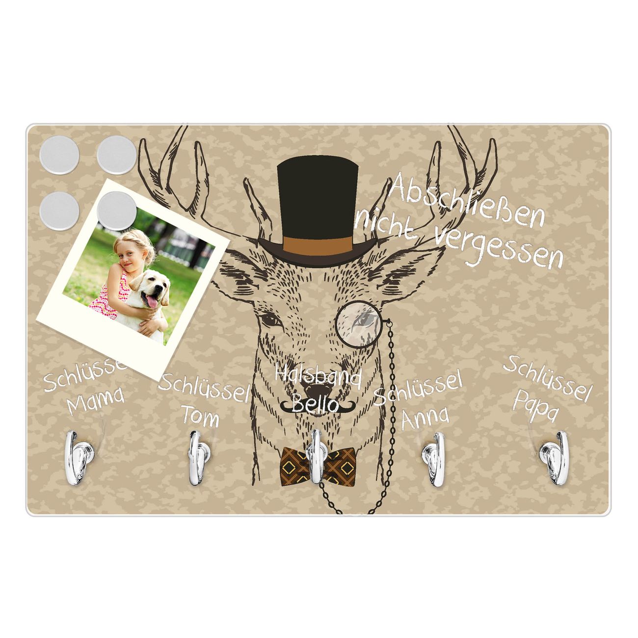FUNKTION: Mit dem banjado Schlüsselbrett Direktor Hirsch hat Ihre Suche nach dem Schlüsselbund endlich ein Ende! Auf gesamt 5 Haken finden auch die größten Schlüssel ihren Platz. Durch den farbenfrohen Motivdruck ist das Schlüsselboard ein Blickfang in jeder Wohnung. DESIGN: Die Schlüsselleiste mit Motiv Direktor Hirsch hat ein sehr ansprechendes und ausgefallenes Design. Das Glasboard besteht aus einer gehärteten Glasscheibe mit dem Motiv Ihrer Wahl. Ihre neue Schlüsselaufbewahrung ist funktionell und ein optisches Highlight. DETAILS: Das Schlüsselbrett ist 30 x 20 x 4,5 CM (BxHxT). Das ganze Board besteht aus gehärtetem Sicherheitsglas, die Haken zur Selbstmontage präsentieren sich in Edelstahl-Optik. Für einen sicheren Halt erfolgt die Aufhängung an 2 vorgefertigten Haltern an der Rückseite. Das Montagematerial fügen wir bei. NUTZEN: Hier findet alles seinen Platz: Schlüsselbunde, Geschirrtücher, Hundeleinen oder Kinderjacken. Das Glas kann mit Kreidestiften bzw. Whiteboard-Marker beschrieben werden, mit extrastarken Neodym-Magneten können Sie auch Notizen anheften. BANJADO: Wir sind ein kleines Team aus dem Herzen von Sachsen und fertigen Ihre neue Schlüsselaufbewahrung von Hand an. Sie erhalten Handarbeit und keine preiswerte Importware. Wir hoffen, dass Ihnen unsere Idee zusagt, herzlichst das banjado Team.
