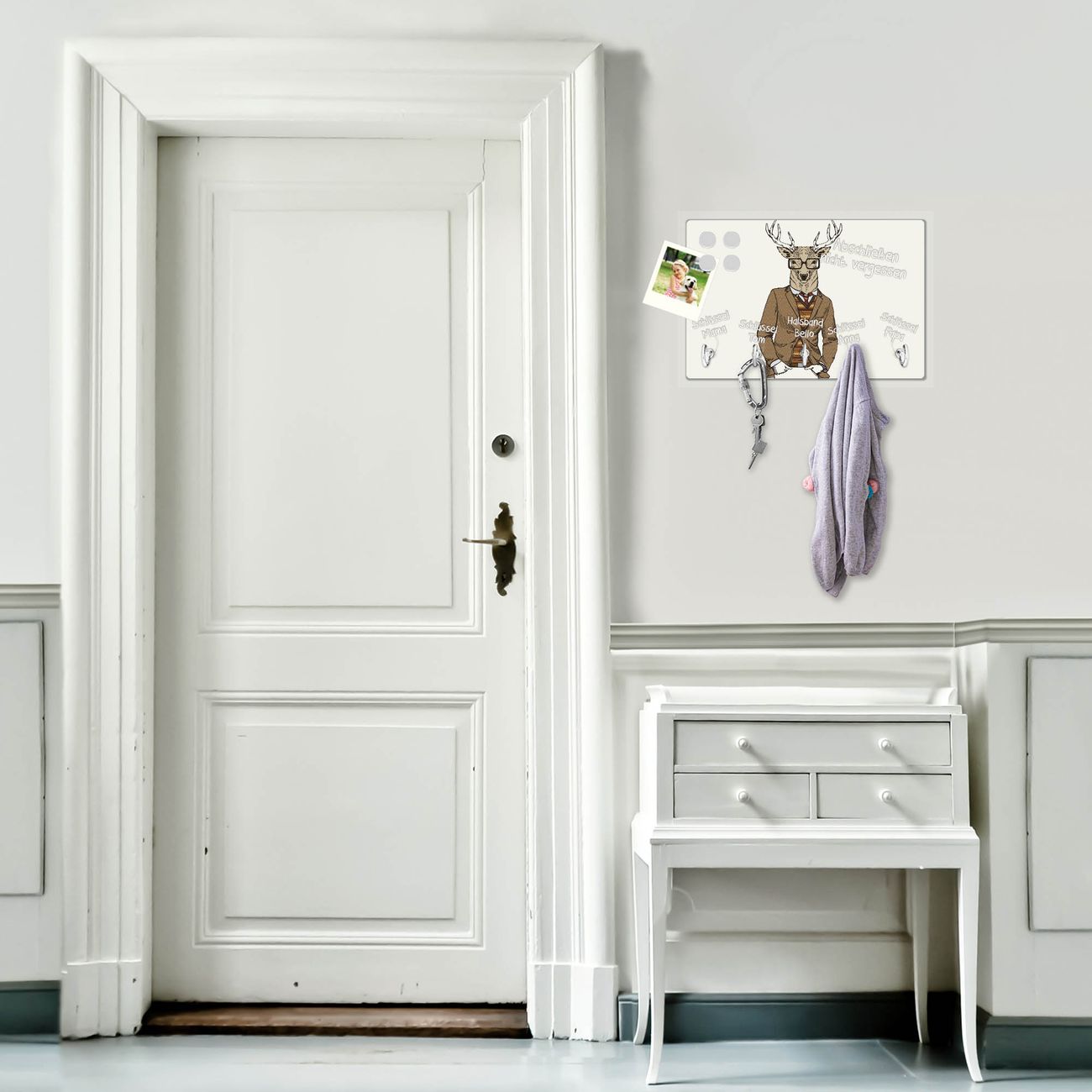 FUNKTION: Mit dem banjado Schlüsselbrett Doktor Hirsch hat Ihre Suche nach dem Schlüsselbund endlich ein Ende! Auf gesamt 5 Haken finden auch die größten Schlüssel ihren Platz. Durch den farbenfrohen Motivdruck ist das Schlüsselboard ein Blickfang in jeder Wohnung. DESIGN: Die Schlüsselleiste mit Motiv Doktor Hirsch hat ein sehr ansprechendes und ausgefallenes Design. Das Glasboard besteht aus einer gehärteten Glasscheibe mit dem Motiv Ihrer Wahl. Ihre neue Schlüsselaufbewahrung ist funktionell und ein optisches Highlight. DETAILS: Das Schlüsselbrett ist 30 x 20 x 4,5 CM (BxHxT). Das ganze Board besteht aus gehärtetem Sicherheitsglas, die Haken zur Selbstmontage präsentieren sich in Edelstahl-Optik. Für einen sicheren Halt erfolgt die Aufhängung an 2 vorgefertigten Haltern an der Rückseite. Das Montagematerial fügen wir bei. NUTZEN: Hier findet alles seinen Platz: Schlüsselbunde, Geschirrtücher, Hundeleinen oder Kinderjacken. Das Glas kann mit Kreidestiften bzw. Whiteboard-Marker beschrieben werden, mit extrastarken Neodym-Magneten können Sie auch Notizen anheften. BANJADO: Wir sind ein kleines Team aus dem Herzen von Sachsen und fertigen Ihre neue Schlüsselaufbewahrung von Hand an. Sie erhalten Handarbeit und keine preiswerte Importware. Wir hoffen, dass Ihnen unsere Idee zusagt, herzlichst das banjado Team.