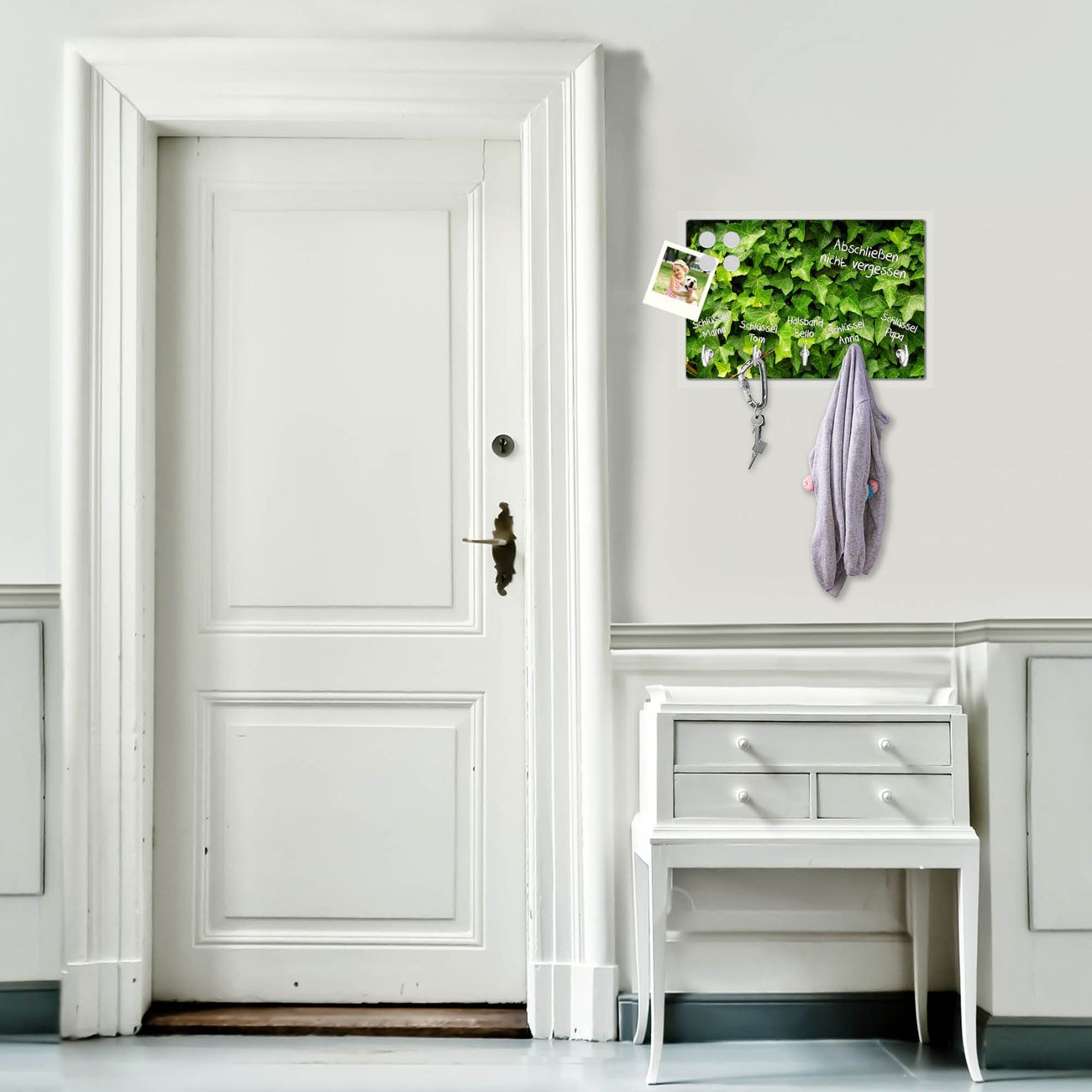 FUNKTION: Mit dem banjado Schlüsselbrett Efeu hat Ihre Suche nach dem Schlüsselbund endlich ein Ende! Auf gesamt 5 Haken finden auch die größten Schlüssel ihren Platz. Durch den farbenfrohen Motivdruck ist das Schlüsselboard ein Blickfang in jeder Wohnung. DESIGN: Die Schlüsselleiste mit Motiv Efeu hat ein sehr ansprechendes und ausgefallenes Design. Das Glasboard besteht aus einer gehärteten Glasscheibe mit dem Motiv Ihrer Wahl. Ihre neue Schlüsselaufbewahrung ist funktionell und ein optisches Highlight. DETAILS: Das Schlüsselbrett ist 30 x 20 x 4,5 CM (BxHxT). Das ganze Board besteht aus gehärtetem Sicherheitsglas, die Haken zur Selbstmontage präsentieren sich in Edelstahl-Optik. Für einen sicheren Halt erfolgt die Aufhängung an 2 vorgefertigten Haltern an der Rückseite. Das Montagematerial fügen wir bei. NUTZEN: Hier findet alles seinen Platz: Schlüsselbunde, Geschirrtücher, Hundeleinen oder Kinderjacken. Das Glas kann mit Kreidestiften bzw. Whiteboard-Marker beschrieben werden, mit extrastarken Neodym-Magneten können Sie auch Notizen anheften. BANJADO: Wir sind ein kleines Team aus dem Herzen von Sachsen und fertigen Ihre neue Schlüsselaufbewahrung von Hand an. Sie erhalten Handarbeit und keine preiswerte Importware. Wir hoffen, dass Ihnen unsere Idee zusagt, herzlichst das banjado Team.
