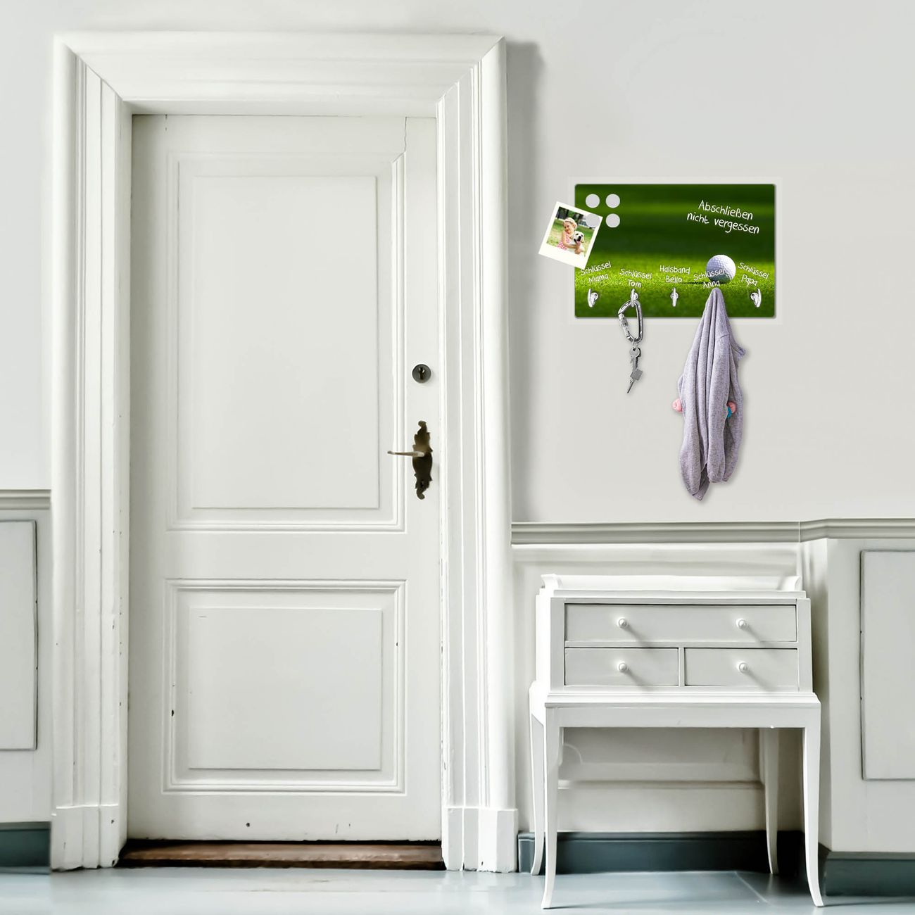 FUNKTION: Mit dem banjado Schlüsselbrett Einsamer Golfball hat Ihre Suche nach dem Schlüsselbund endlich ein Ende! Auf gesamt 5 Haken finden auch die größten Schlüssel ihren Platz. Durch den farbenfrohen Motivdruck ist das Schlüsselboard ein Blickfang in jeder Wohnung. DESIGN: Die Schlüsselleiste mit Motiv Einsamer Golfball hat ein sehr ansprechendes und ausgefallenes Design. Das Glasboard besteht aus einer gehärteten Glasscheibe mit dem Motiv Ihrer Wahl. Ihre neue Schlüsselaufbewahrung ist funktionell und ein optisches Highlight. DETAILS: Das Schlüsselbrett ist 30 x 20 x 4,5 CM (BxHxT). Das ganze Board besteht aus gehärtetem Sicherheitsglas, die Haken zur Selbstmontage präsentieren sich in Edelstahl-Optik. Für einen sicheren Halt erfolgt die Aufhängung an 2 vorgefertigten Haltern an der Rückseite. Das Montagematerial fügen wir bei. NUTZEN: Hier findet alles seinen Platz: Schlüsselbunde, Geschirrtücher, Hundeleinen oder Kinderjacken. Das Glas kann mit Kreidestiften bzw. Whiteboard-Marker beschrieben werden, mit extrastarken Neodym-Magneten können Sie auch Notizen anheften. BANJADO: Wir sind ein kleines Team aus dem Herzen von Sachsen und fertigen Ihre neue Schlüsselaufbewahrung von Hand an. Sie erhalten Handarbeit und keine preiswerte Importware. Wir hoffen, dass Ihnen unsere Idee zusagt, herzlichst das banjado Team.