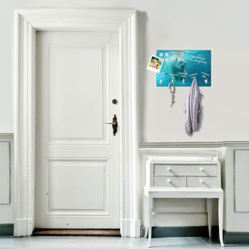 FUNKTION: Mit dem banjado Schlüsselbrett Eisbär unter Wasser hat Ihre Suche nach dem Schlüsselbund endlich ein Ende! Auf gesamt 5 Haken finden auch die größten Schlüssel ihren Platz. Durch den farbenfrohen Motivdruck ist das Schlüsselboard ein Blickfang in jeder Wohnung. DESIGN: Die Schlüsselleiste mit Motiv Eisbär unter Wasser hat ein sehr ansprechendes und ausgefallenes Design. Das Glasboard besteht aus einer gehärteten Glasscheibe mit dem Motiv Ihrer Wahl. Ihre neue Schlüsselaufbewahrung ist funktionell und ein optisches Highlight. DETAILS: Das Schlüsselbrett ist 30 x 20 x 4,5 CM (BxHxT). Das ganze Board besteht aus gehärtetem Sicherheitsglas, die Haken zur Selbstmontage präsentieren sich in Edelstahl-Optik. Für einen sicheren Halt erfolgt die Aufhängung an 2 vorgefertigten Haltern an der Rückseite. Das Montagematerial fügen wir bei. NUTZEN: Hier findet alles seinen Platz: Schlüsselbunde, Geschirrtücher, Hundeleinen oder Kinderjacken. Das Glas kann mit Kreidestiften bzw. Whiteboard-Marker beschrieben werden, mit extrastarken Neodym-Magneten können Sie auch Notizen anheften. BANJADO: Wir sind ein kleines Team aus dem Herzen von Sachsen und fertigen Ihre neue Schlüsselaufbewahrung von Hand an. Sie erhalten Handarbeit und keine preiswerte Importware. Wir hoffen, dass Ihnen unsere Idee zusagt, herzlichst das banjado Team.