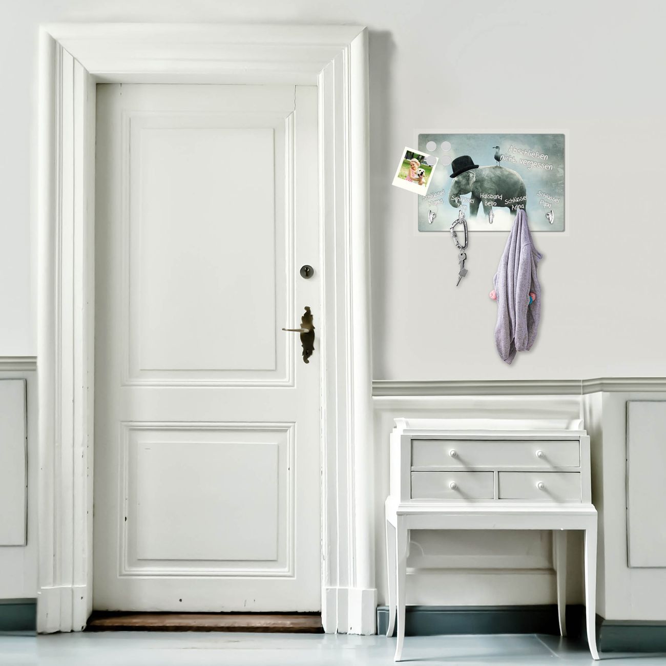 FUNKTION: Mit dem banjado Schlüsselbrett Elefant und Möwe hat Ihre Suche nach dem Schlüsselbund endlich ein Ende! Auf gesamt 5 Haken finden auch die größten Schlüssel ihren Platz. Durch den farbenfrohen Motivdruck ist das Schlüsselboard ein Blickfang in jeder Wohnung. DESIGN: Die Schlüsselleiste mit Motiv Elefant und Möwe hat ein sehr ansprechendes und ausgefallenes Design. Das Glasboard besteht aus einer gehärteten Glasscheibe mit dem Motiv Ihrer Wahl. Ihre neue Schlüsselaufbewahrung ist funktionell und ein optisches Highlight. DETAILS: Das Schlüsselbrett ist 30 x 20 x 4,5 CM (BxHxT). Das ganze Board besteht aus gehärtetem Sicherheitsglas, die Haken zur Selbstmontage präsentieren sich in Edelstahl-Optik. Für einen sicheren Halt erfolgt die Aufhängung an 2 vorgefertigten Haltern an der Rückseite. Das Montagematerial fügen wir bei. NUTZEN: Hier findet alles seinen Platz: Schlüsselbunde, Geschirrtücher, Hundeleinen oder Kinderjacken. Das Glas kann mit Kreidestiften bzw. Whiteboard-Marker beschrieben werden, mit extrastarken Neodym-Magneten können Sie auch Notizen anheften. BANJADO: Wir sind ein kleines Team aus dem Herzen von Sachsen und fertigen Ihre neue Schlüsselaufbewahrung von Hand an. Sie erhalten Handarbeit und keine preiswerte Importware. Wir hoffen, dass Ihnen unsere Idee zusagt, herzlichst das banjado Team.
