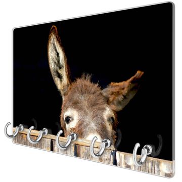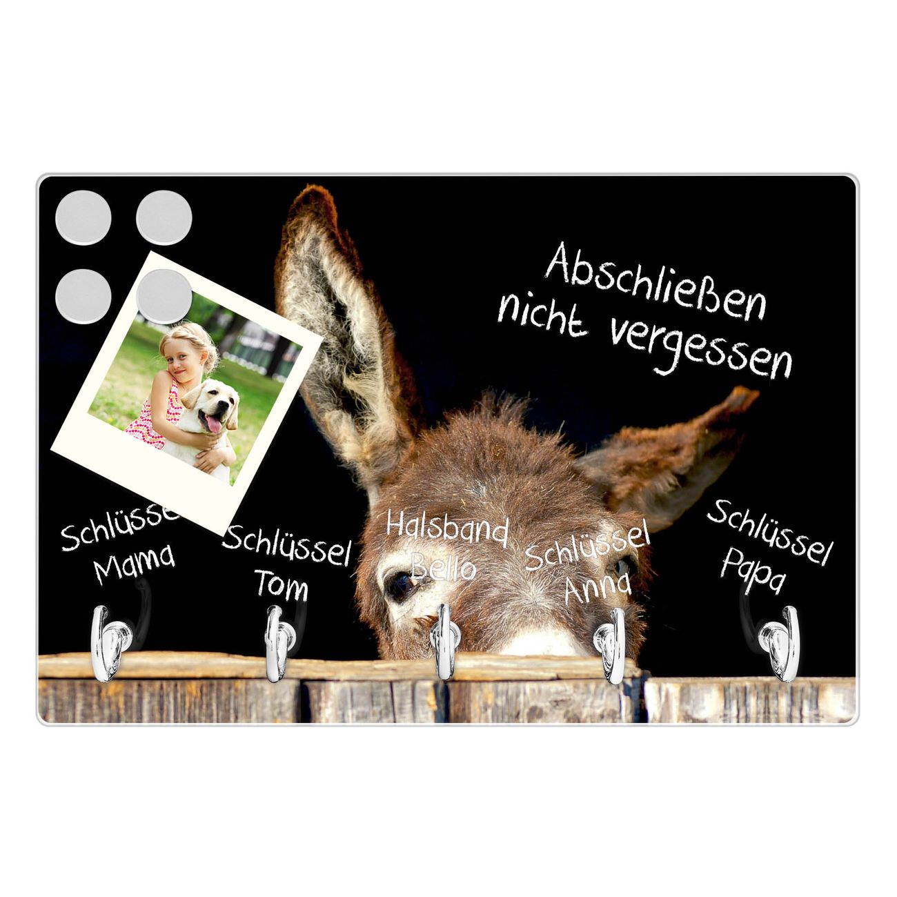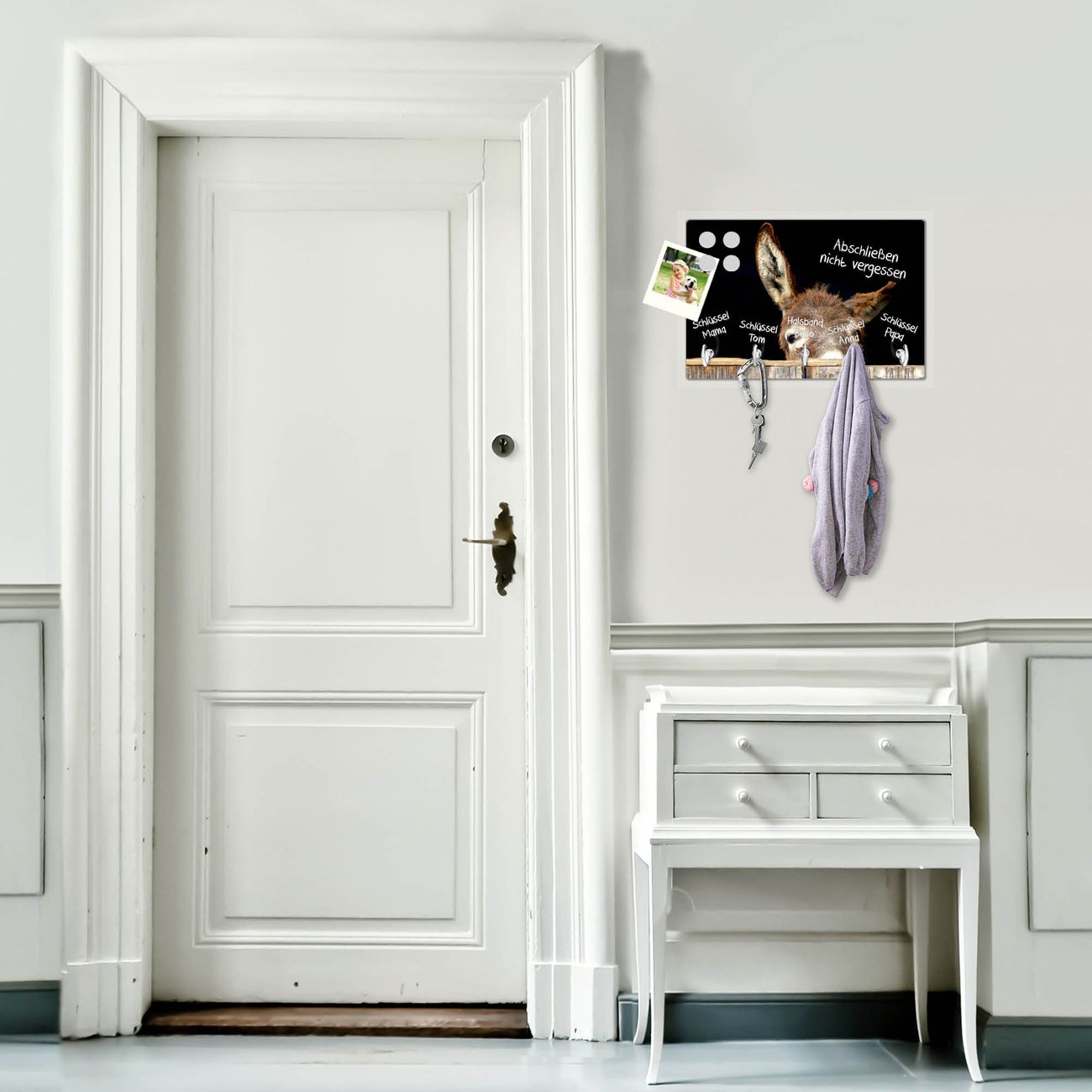 FUNKTION: Mit dem banjado Schlüsselbrett Esel hat Ihre Suche nach dem Schlüsselbund endlich ein Ende! Auf gesamt 5 Haken finden auch die größten Schlüssel ihren Platz. Durch den farbenfrohen Motivdruck ist das Schlüsselboard ein Blickfang in jeder Wohnung. DESIGN: Die Schlüsselleiste mit Motiv Esel hat ein sehr ansprechendes und ausgefallenes Design. Das Glasboard besteht aus einer gehärteten Glasscheibe mit dem Motiv Ihrer Wahl. Ihre neue Schlüsselaufbewahrung ist funktionell und ein optisches Highlight. DETAILS: Das Schlüsselbrett ist 30 x 20 x 4,5 CM (BxHxT). Das ganze Board besteht aus gehärtetem Sicherheitsglas, die Haken zur Selbstmontage präsentieren sich in Edelstahl-Optik. Für einen sicheren Halt erfolgt die Aufhängung an 2 vorgefertigten Haltern an der Rückseite. Das Montagematerial fügen wir bei. NUTZEN: Hier findet alles seinen Platz: Schlüsselbunde, Geschirrtücher, Hundeleinen oder Kinderjacken. Das Glas kann mit Kreidestiften bzw. Whiteboard-Marker beschrieben werden, mit extrastarken Neodym-Magneten können Sie auch Notizen anheften. BANJADO: Wir sind ein kleines Team aus dem Herzen von Sachsen und fertigen Ihre neue Schlüsselaufbewahrung von Hand an. Sie erhalten Handarbeit und keine preiswerte Importware. Wir hoffen, dass Ihnen unsere Idee zusagt, herzlichst das banjado Team.