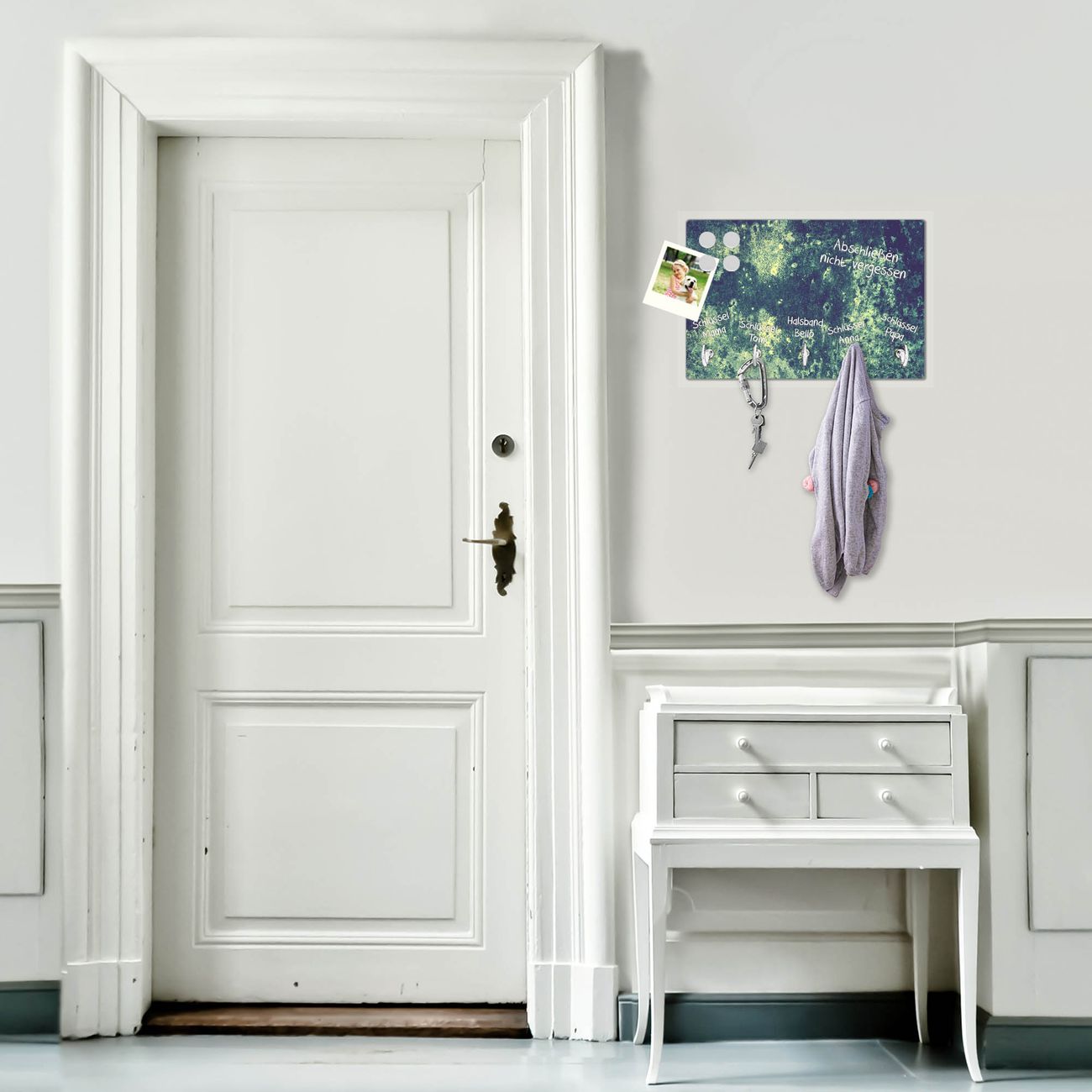 FUNKTION: Mit dem banjado Schlüsselbrett Farbuniversum hat Ihre Suche nach dem Schlüsselbund endlich ein Ende! Auf gesamt 5 Haken finden auch die größten Schlüssel ihren Platz. Durch den farbenfrohen Motivdruck ist das Schlüsselboard ein Blickfang in jeder Wohnung. DESIGN: Die Schlüsselleiste mit Motiv Farbuniversum hat ein sehr ansprechendes und ausgefallenes Design. Das Glasboard besteht aus einer gehärteten Glasscheibe mit dem Motiv Ihrer Wahl. Ihre neue Schlüsselaufbewahrung ist funktionell und ein optisches Highlight. DETAILS: Das Schlüsselbrett ist 30 x 20 x 4,5 CM (BxHxT). Das ganze Board besteht aus gehärtetem Sicherheitsglas, die Haken zur Selbstmontage präsentieren sich in Edelstahl-Optik. Für einen sicheren Halt erfolgt die Aufhängung an 2 vorgefertigten Haltern an der Rückseite. Das Montagematerial fügen wir bei. NUTZEN: Hier findet alles seinen Platz: Schlüsselbunde, Geschirrtücher, Hundeleinen oder Kinderjacken. Das Glas kann mit Kreidestiften bzw. Whiteboard-Marker beschrieben werden, mit extrastarken Neodym-Magneten können Sie auch Notizen anheften. BANJADO: Wir sind ein kleines Team aus dem Herzen von Sachsen und fertigen Ihre neue Schlüsselaufbewahrung von Hand an. Sie erhalten Handarbeit und keine preiswerte Importware. Wir hoffen, dass Ihnen unsere Idee zusagt, herzlichst das banjado Team.